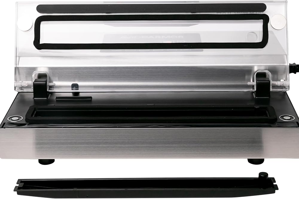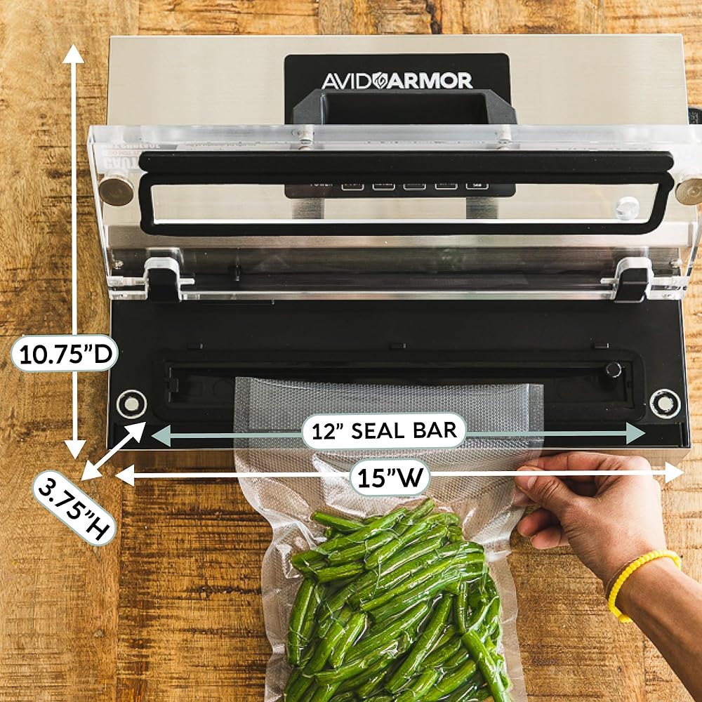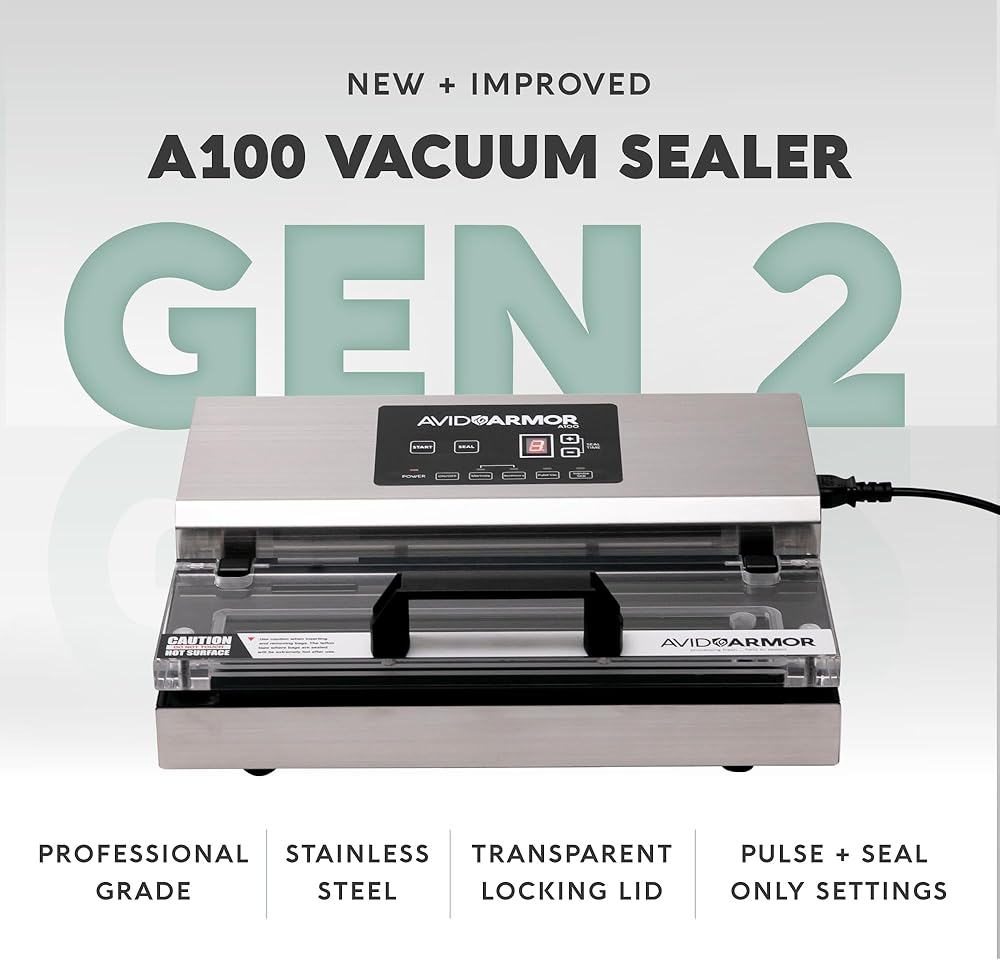 ماكينة سد الفراغات من Avid Armor - هيكل من الفولاذ المقاوم للصدأ A100، غطاء شفاف، مضخة مكبس مزدوجة تجارية عالية التحمل 12 شريط إغلاق عريض مدمج في مروحة تبريد تتضمن 30 كيسًا مقطوعًا مسبقًا وخرطومًا ملحقًا