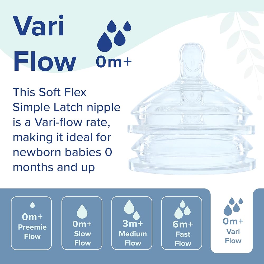 • FAST FLOW NIPPLE BOTTLE: Fast-flow design is ideal for babies 6 months and up who are ready to feed at a faster rate; Soft Flex Simple Latch Nipple is designed to encourage latching; Soft silicone nipples have internal ridges to prevent collapsing