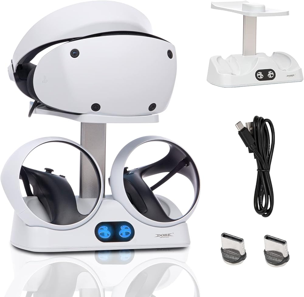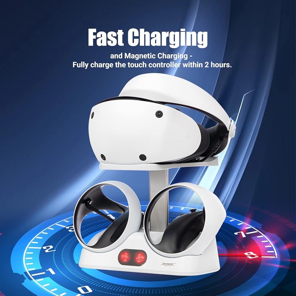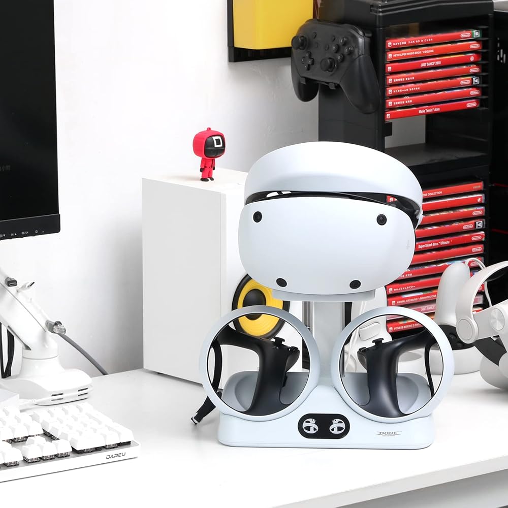 محطة شحن وحدة التحكم PSVR2 متعددة الوظائف - تم تصميم قاعدة الشحن PSVR2 خصيصًا لوحدات التحكم PSVR2، والتي يمكنها شحن وحدات التحكم المزدوجة في نفس الوقت. عندما يتم شحن وحدات التحكم VR اليسرى واليمنى، يمكنك وضع سماعة الرأس PS VR2 الخاصة بك على الدرج العلوي للحامل.