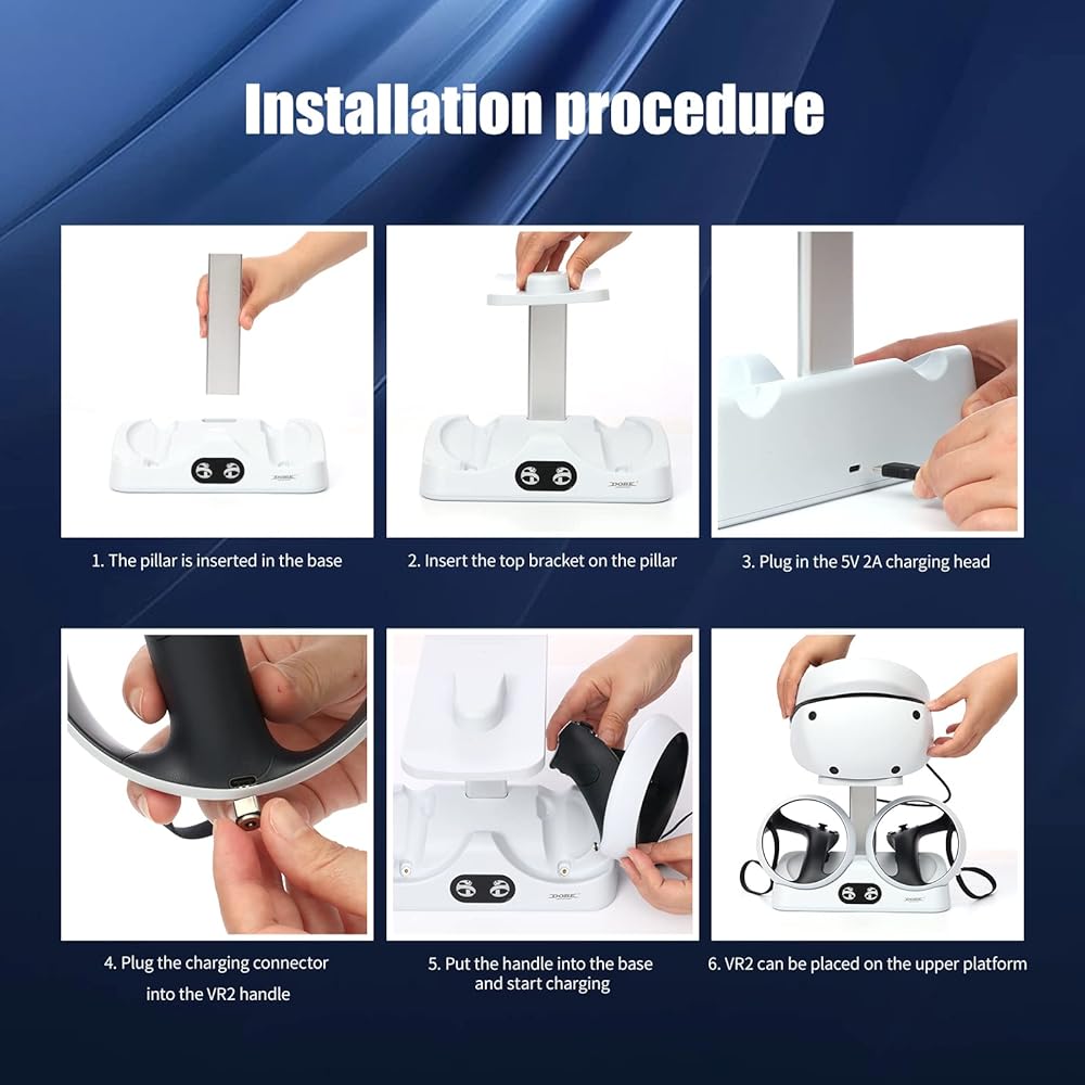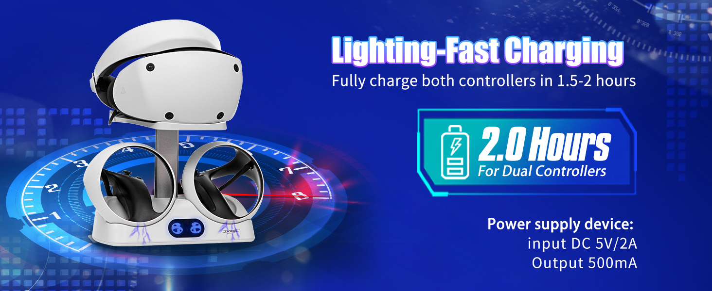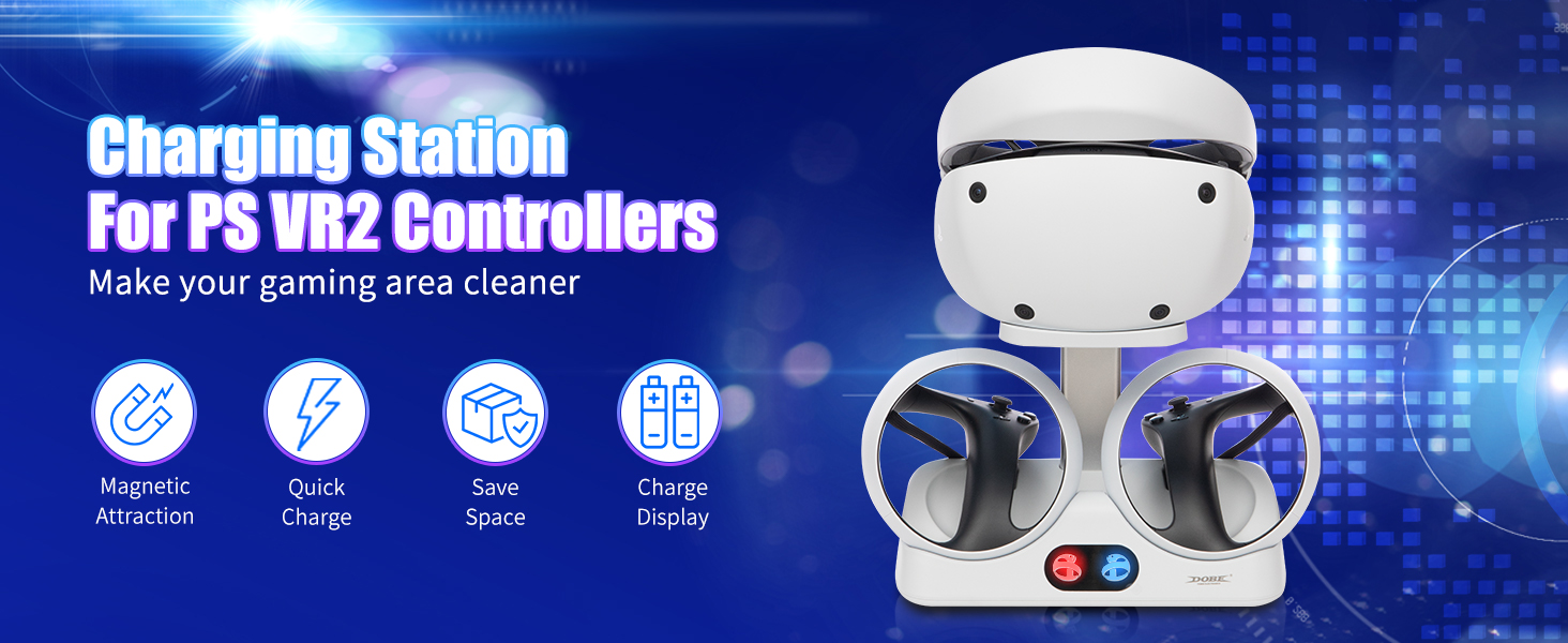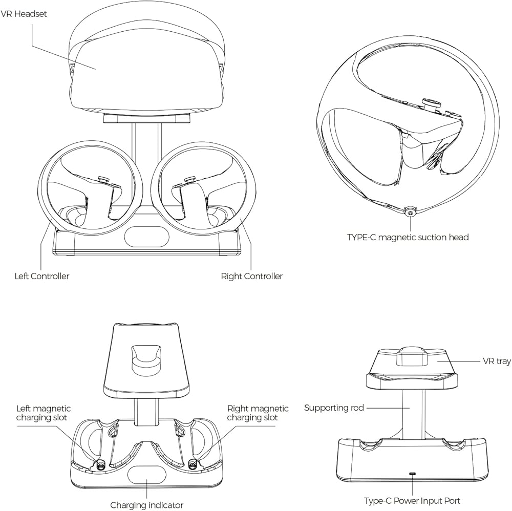 محطة شحن وحدة التحكم PSVR2 متعددة الوظائف - تم تصميم قاعدة الشحن PSVR2 خصيصًا لوحدات التحكم PSVR2، والتي يمكنها شحن وحدات التحكم المزدوجة في نفس الوقت. عندما يتم شحن وحدات التحكم VR اليسرى واليمنى، يمكنك وضع سماعة الرأس PS VR2 الخاصة بك على الدرج العلوي للحامل.