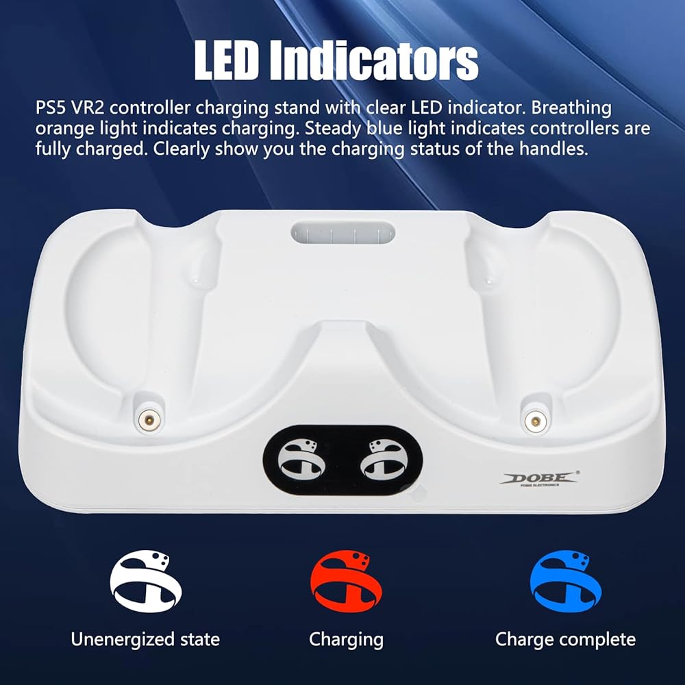 مؤشرات LED - يحتوي هذا المنتج على دائرة تحكم مدمجة عالية الدقة في المعالجات الدقيقة. حامل شحن وحدة التحكم PS5 VR2 مع مؤشر LED واضح. يشير التنفس باللون البرتقالي إلى الشحن. يشير الضوء الأزرق الثابت إلى أن وحدات التحكم مشحونة بالكامل. تظهر لك بوضوح حالة شحن المقابض.