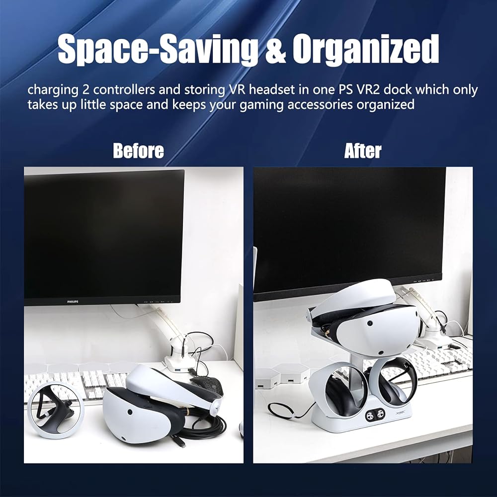 توفير المساحة وتنظيمها - تعد محطة الشحن هذه لجهاز PSVR2 ملحقًا أساسيًا لجهاز PS VR2، حيث تشحن وحدتي تحكم وتخزن سماعة الرأس VR في قاعدة توصيل PS VR2 واحدة والتي لا تشغل سوى مساحة صغيرة وتحافظ على ملحقات الألعاب الخاصة بك منظمة. مما يسمح لك بمنع تلف مجموعة الواقع الافتراضي الخاصة بك، والحفاظ على منطقة الألعاب الخاصة بك نظيفة ومنظمة في جميع الأوقات.