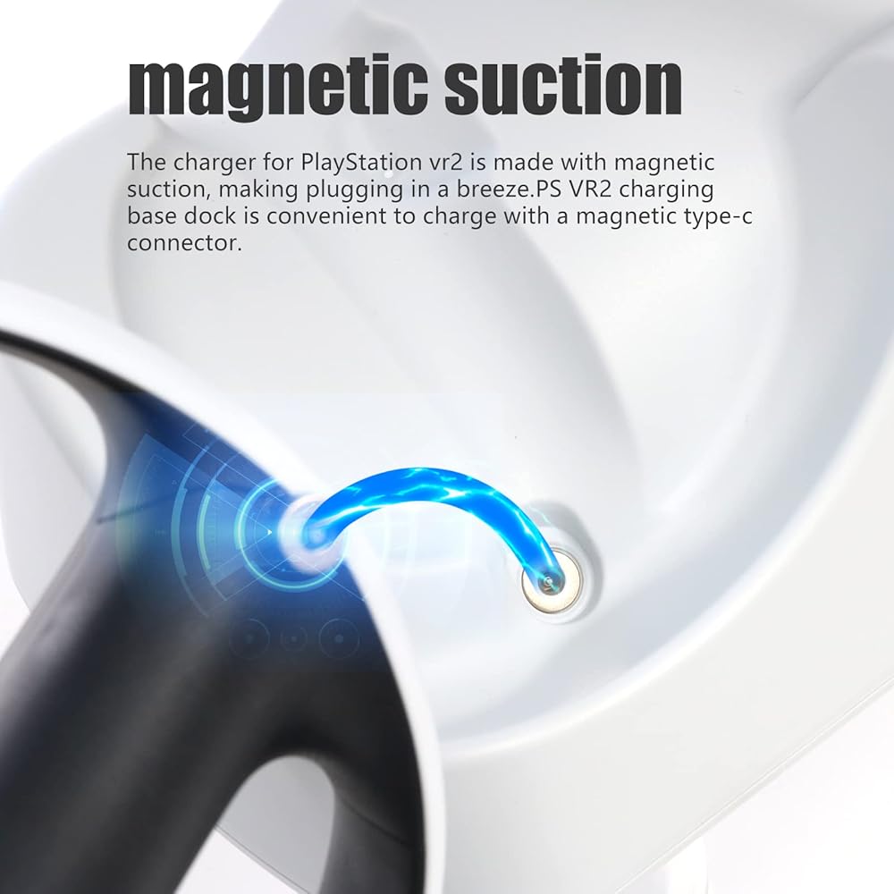 شحن سريع وشحن مغناطيسي - قم بشحن وحدة التحكم باللمس بالكامل خلال ساعتين. تم تصنيع شاحن PlayStation vr2 بالشفط المغناطيسي، مما يجعل توصيله أمرًا سهلاً. قاعدة شحن PS VR2 ملائمة للشحن باستخدام موصل مغناطيسي من النوع c. قبل الشحن، تحتاج إلى إدخال الدونجل المغناطيسي من النوع c في وحدة التحكم PS VR 2 Sens أولاً، ثم وضع وحدات التحكم PS VR2 في فتحة الشحن على جانبي المحطة.