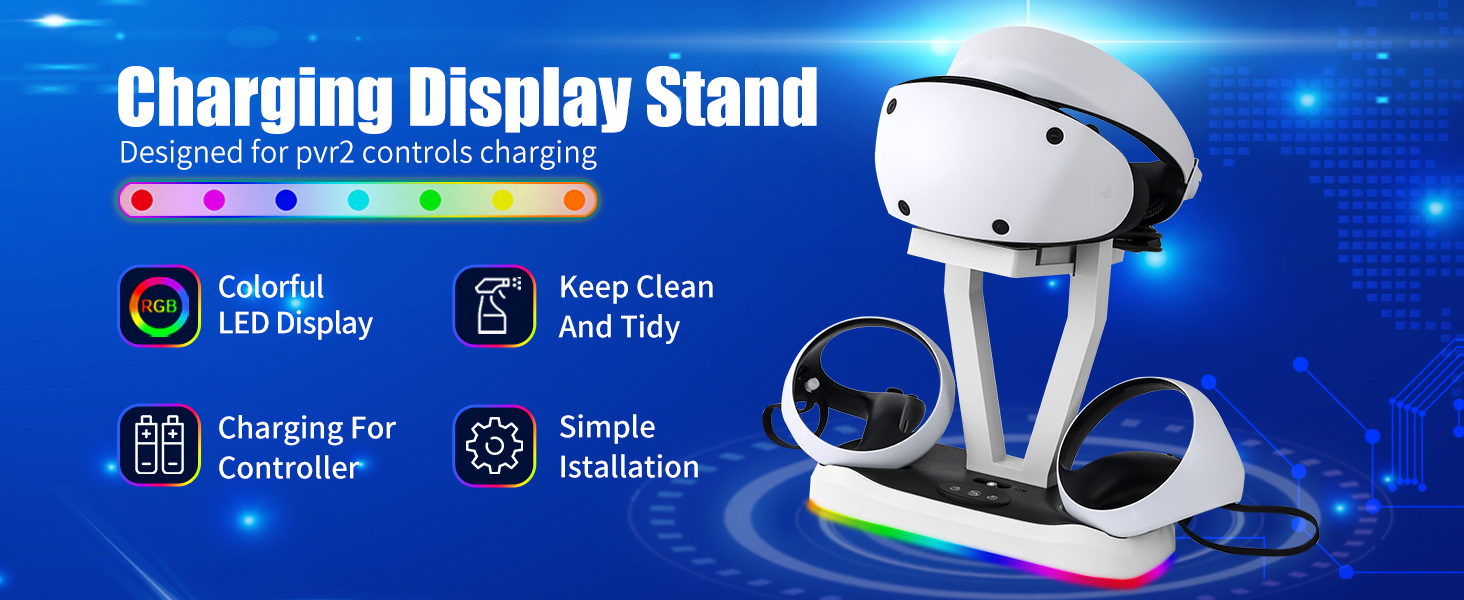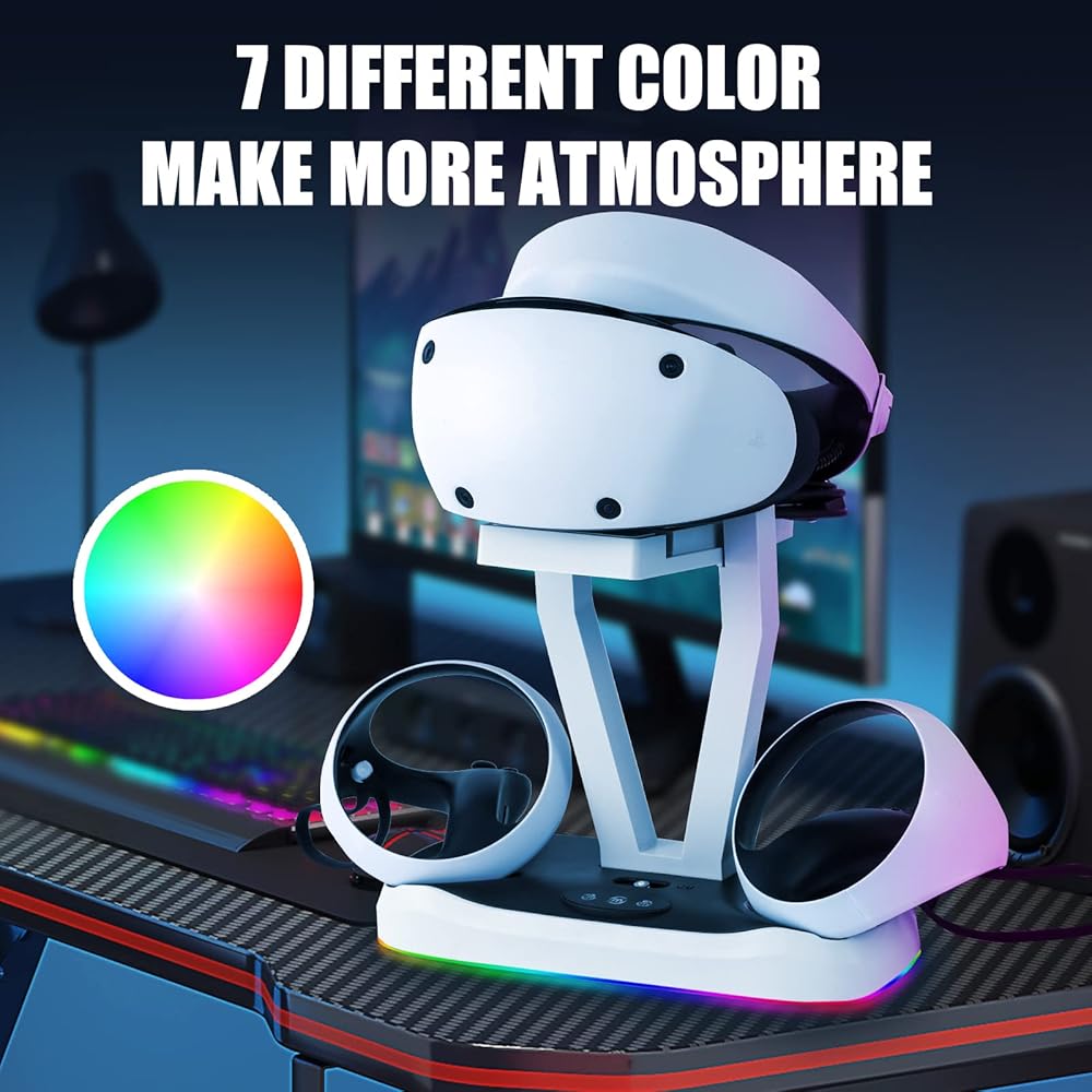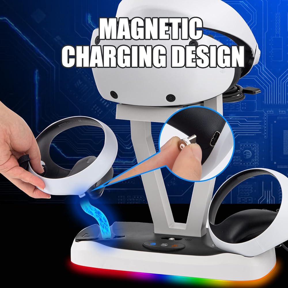 حامل عرض سماعة الرأس PSVR2 - إنها ليست فقط محطة شحن وحدة التحكم PS5 VR2، ولكن يمكن استخدامها أيضًا كحامل سماعة رأس VR2. تحافظ محطة شحن وحدة التحكم PSVR2 على جميع ملحقات PS VR2 الخاصة بك في مكان واحد. ويضيف تصميمها الأنيق وأضواءها الملونة جمالية أنيقة إلى شاشة الواقع الافتراضي الخاصة بك.