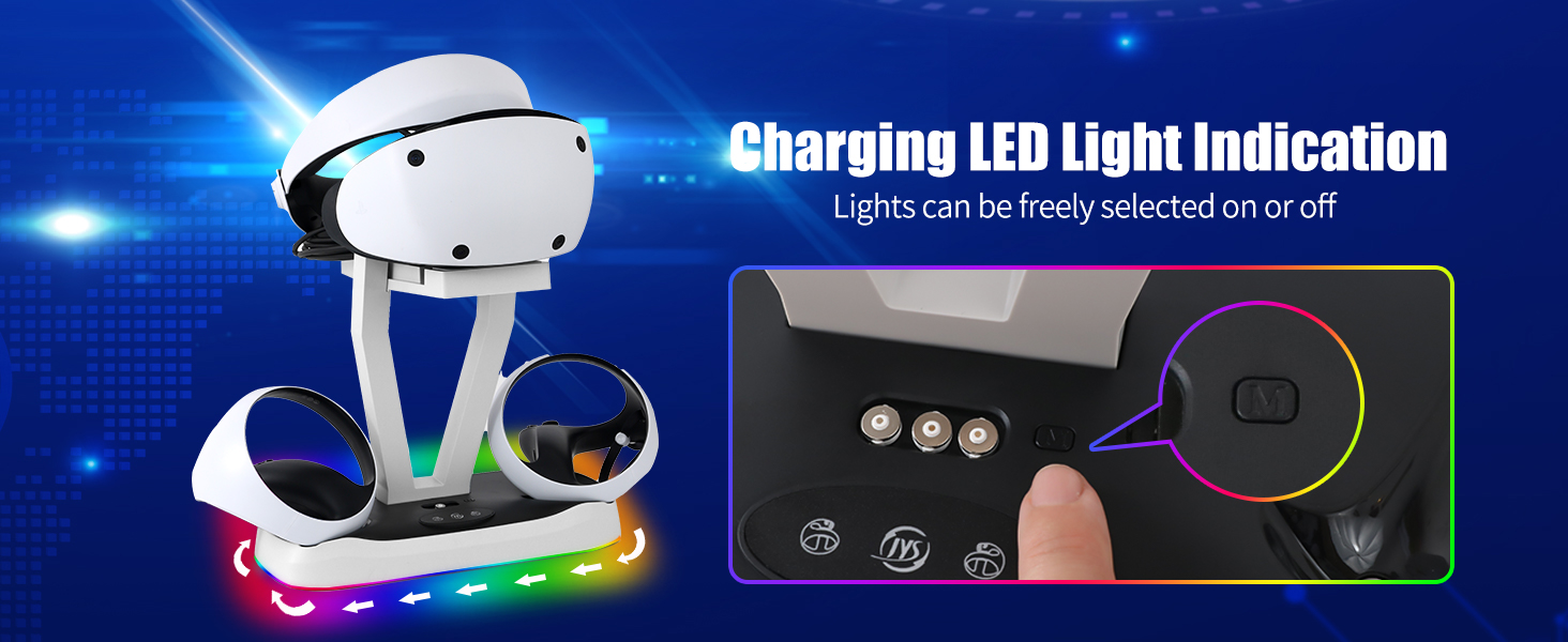 إضاءة RGB ديناميكية - محطة شحن PSVR 2 هذه مجهزة بأضواء محيطة. يخلق وضع الإضاءة RGB تجربة شحن وألعاب رائعة. مع 7 ألوان مختلفة من الأحمر والأخضر والأزرق والأصفر والسماوي والأرجواني والأبيض، قم بتغيير وضع اللون بالضغط على الزر، مما يخلق إحساسًا رائعًا بالتكنولوجيا لقاعدة الشحن الخاصة بك.