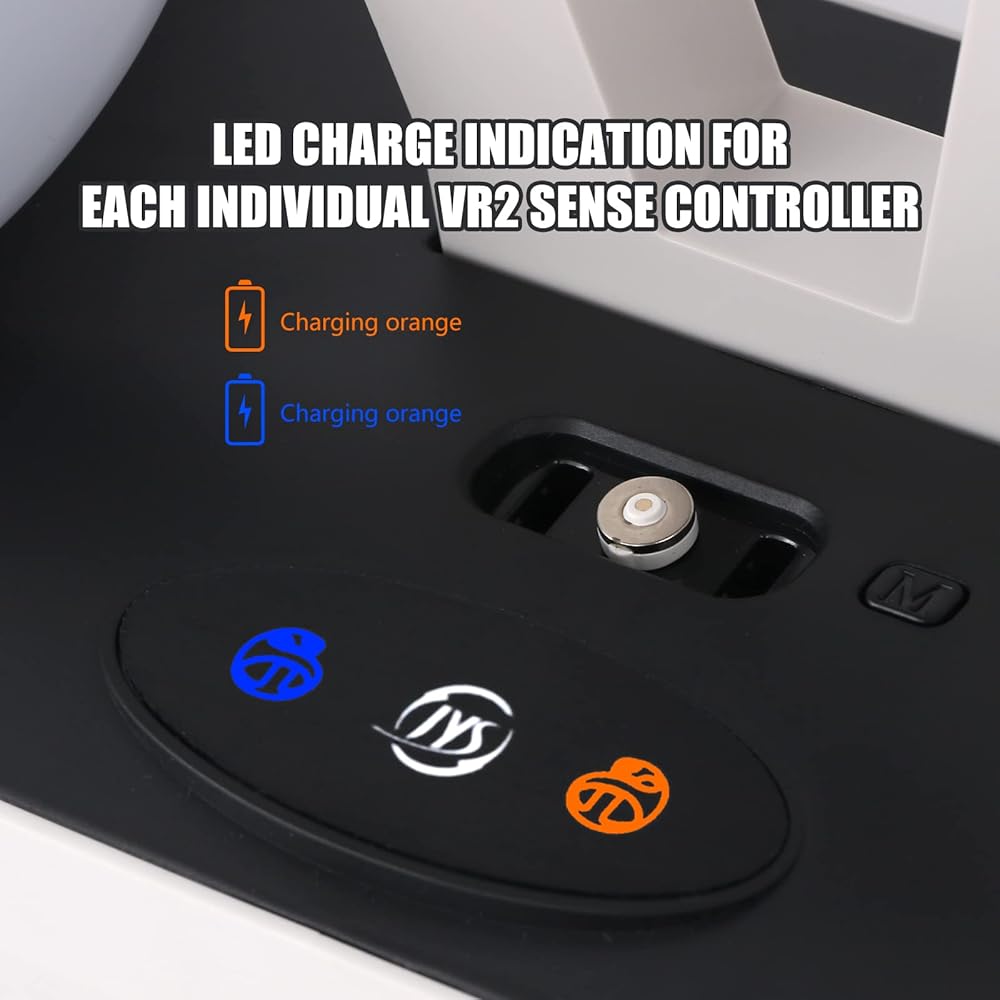 مؤشرات LED - تم تصميم حامل شحن وحدة التحكم PS5 VR2 بمصابيح LED في منتصف المحطة للإشارة إلى حالة شحن وحدات التحكم. يشير الضوء البرتقالي المتنفس إلى الشحن. ويشير الضوء الأزرق الثابت إلى أن وحدات التحكم مشحونة بالكامل.