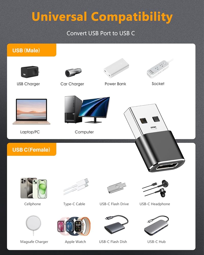 ❤️【محول USB C أنثى إلى USB ذكر】: يدعم محول USB سرعة نقل البيانات USB 2.0 حتى 480 ميجابايت في الثانية، والشحن السريع حتى 18 وات (9V2A/ 5V3A). متوافق مع iPhone 15 Pro/15 Pro Max/15 Plus/15/14/14 Plus/14 Pro/14 Pro Max/13 Pro Max، مع iPad Pro 11,12.9، مع iPad Air، مع iPad Mini؛ مع Apple Watch 9/8/7/6/5/Ultra 2/1؛Galaxy S23/S23 Ultra؛Google Pixel؛سماعات رأس من النوع C، محرك أقراص فلاش، قارئ بطاقات، كاميرا ويب، لوحات مفاتيح، ماوس.❌ ملاحظة: لا يوجد دعم نقل إشارة الفيديو مثل HDMI، VGA.