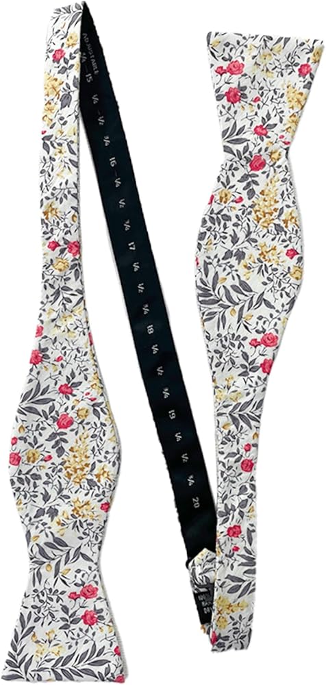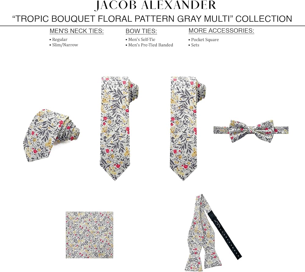 From brand Jacob Alexander, is this tropic bouquet floral pattern men's regular sized classic traditional freestyle self-tie bow tie made with 100% cotton. Once tied, the bow will measure 4.75 inches (12 cm) long by 2.5 inches (6.5 cm) high. Fits up to a 20 inches (50 cm) neck.
