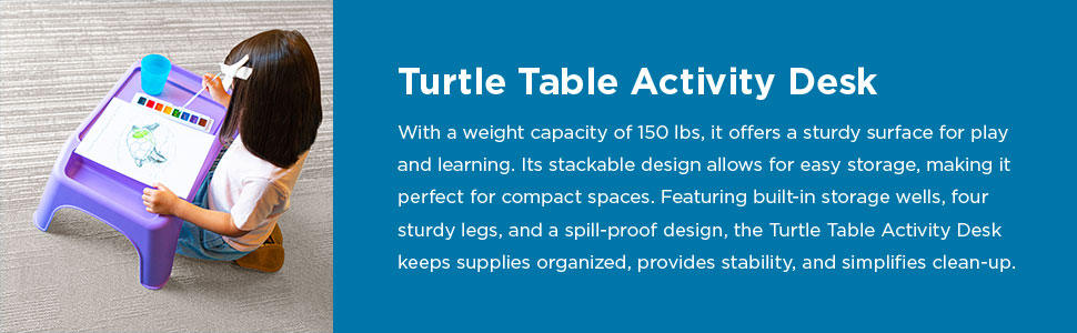 Multiuse Magic: Whether it's snack time, study time, or show time, the Turtle Table activity desk is your go-to solution. With dual storage wells, all necessary items are just within reach.