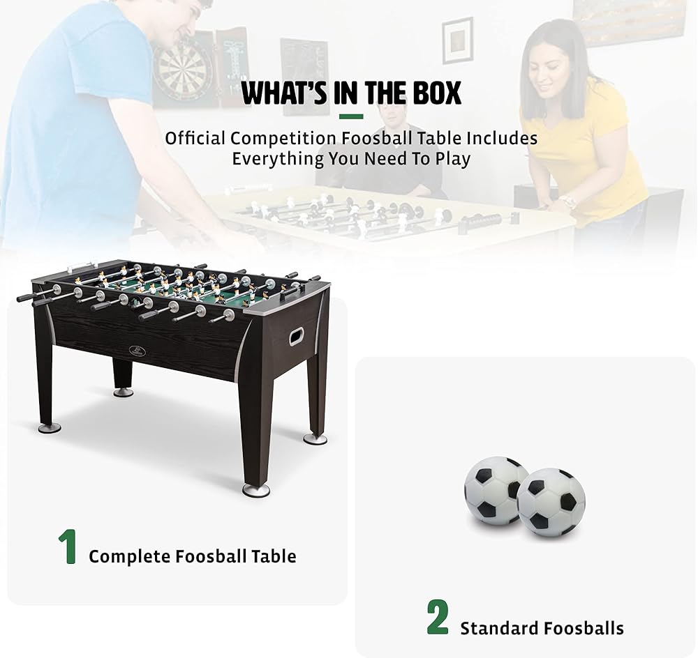 COMPLETE SET INCLUDES - (1) Foosball Table, (2) Soccer Foosball Balls. With pre-assembled, quick-connect rods, you can assemble this classic game in a snap and jump right into the action.