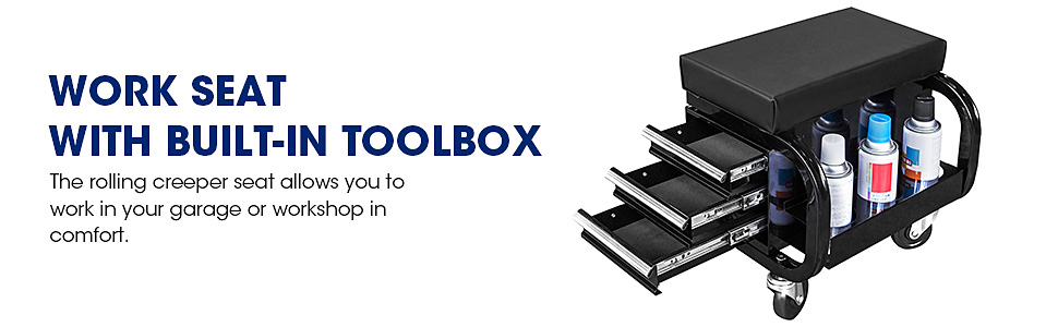 The rolling creeper seat allows you to work in your garage or workshop in comfort. This shop stool features a soft, fully padded vinyl-lined seat. Constructed with heavy-duty steel for stability and long-term durability. Three built-in, pull-out drawers allows for quick and easy access to your tools. Onboard side storage slots help keep essentials within reach. This mechanic stool creeper seat is equipped with (4) 360-degree swivel casters which deliver smooth and precise movements. Measures 14.57" L x 15.75" W x 14.45" H. Includes a limited 1 year manufacturer warranty.