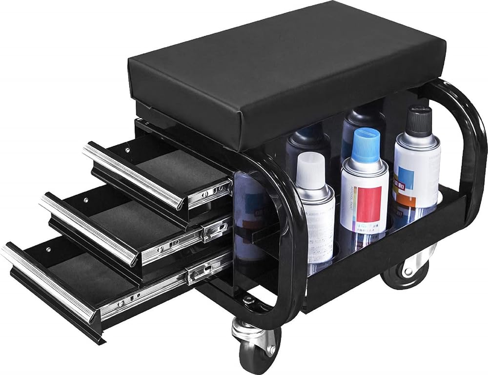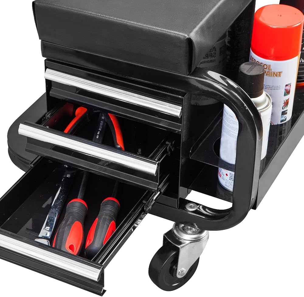 The multifunctional rolling stool with three built-in drawers.Ball bearing slides on both drawers,so you can You can easily access the tools.