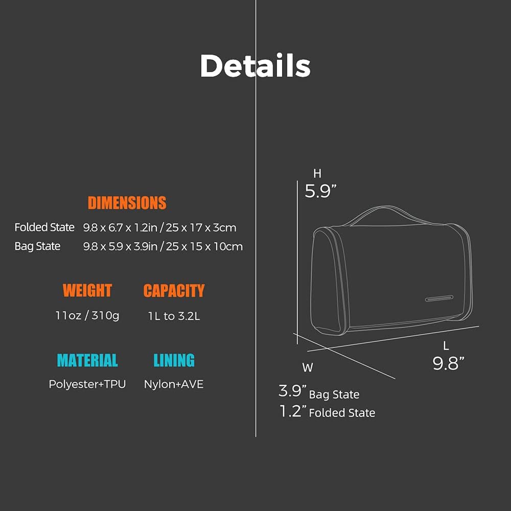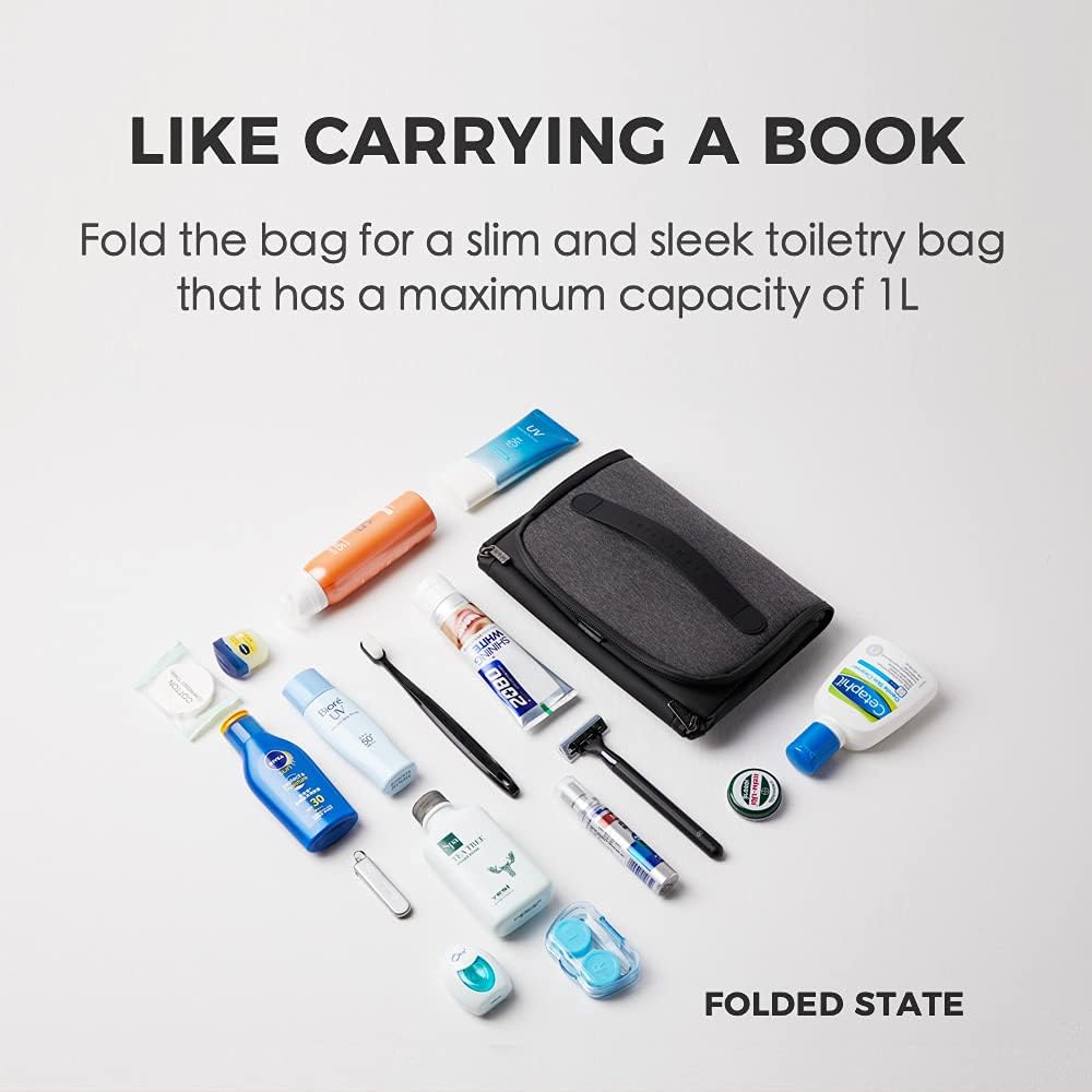 مثل حمل كتاب / حالة مطوية - كيفية تخزين أدوات النظافة الضرورية في مساحة محدودة؟ قم بطي الحقيبة للحصول على حقيبة أدوات الزينة رفيعة وأنيقة بسعة قصوى تصل إلى 1 لتر. يمكنك تعبئة أشياء مثل فرشاة الأسنان وشفرات الحلاقة والعطور والعدسات اللاصقة بسهولة. في حالتها المدمجة، تكون حقيبة أدوات الزينة المطوية رفيعة مثل الكتاب، مما يتناسب بشكل جيد مع حقيبة الظهر أو حقيبة اليد أو حقيبتك.