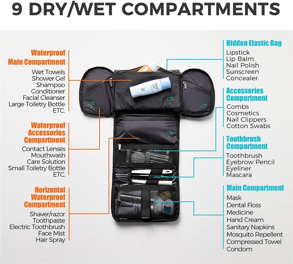 9 أقسام منفصلة جافة ورطبة - تنقسم الحقيبة إلى منطقتين، واحدة رطبة والأخرى جافة، مع مساحات تخزين في 9 أحجام مختلفة لتحقيق أقصى استفادة من المساحة الداخلية. تحتوي المنطقة الرطبة على علامات للتذكير، بينما المنطقة الجافة مصنوعة من شبكة نايلون شفافة معززة بحيث يمكنك تخزين أغراضك والوصول إليها بسرعة.