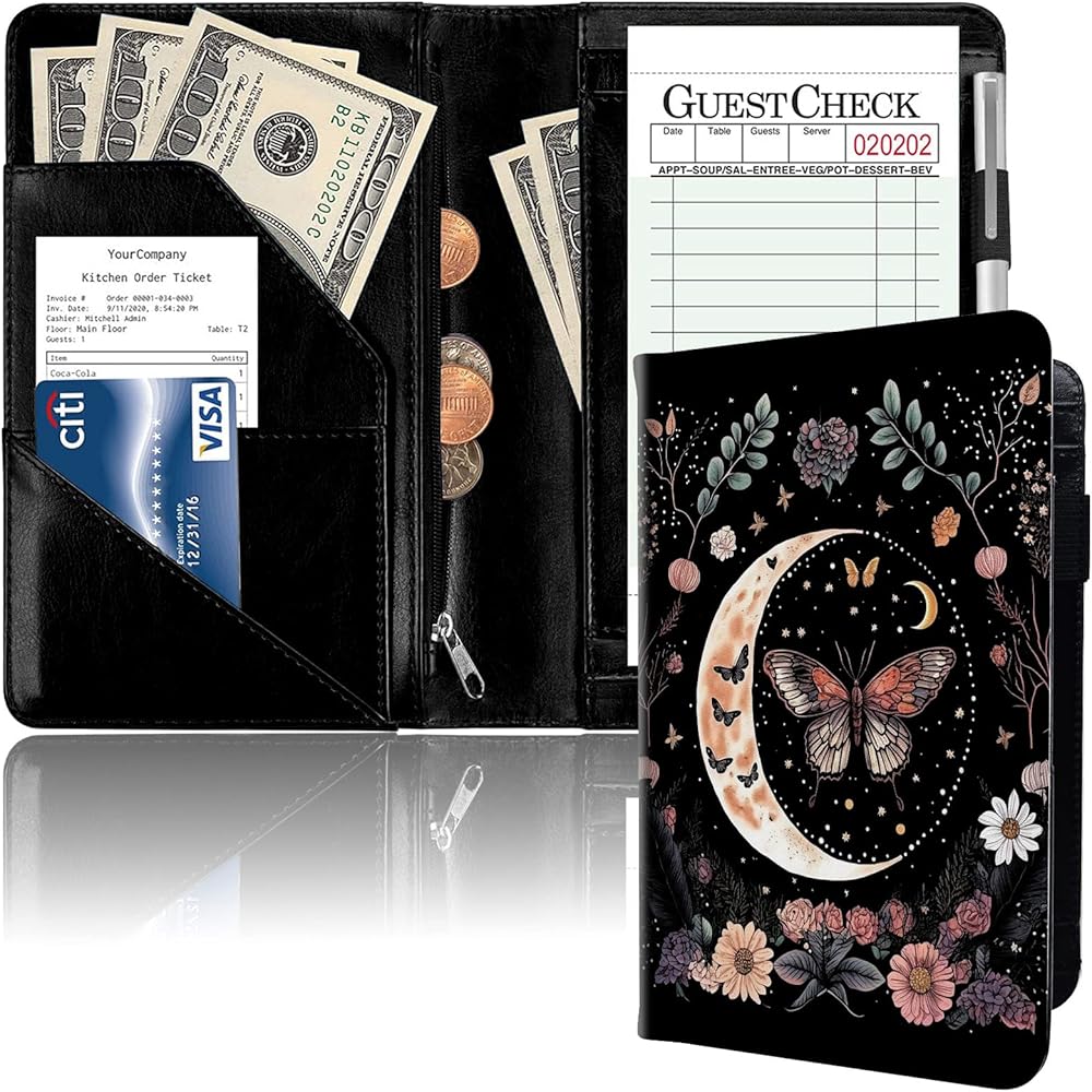 كتاب خادم للنادلة، محفظة جلدية لخادم النادل مع جيب بسحاب، كتاب نادلة لطيف ومنظم طاقم النادل مع جيب المال، مريلة خادم مناسبة، قمر فراشة جمالي