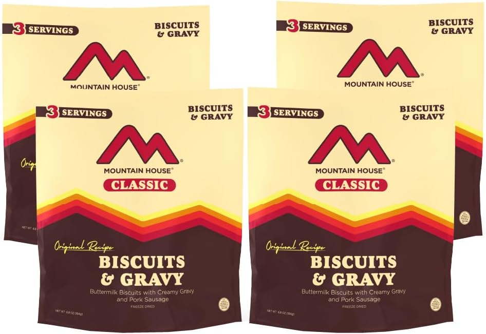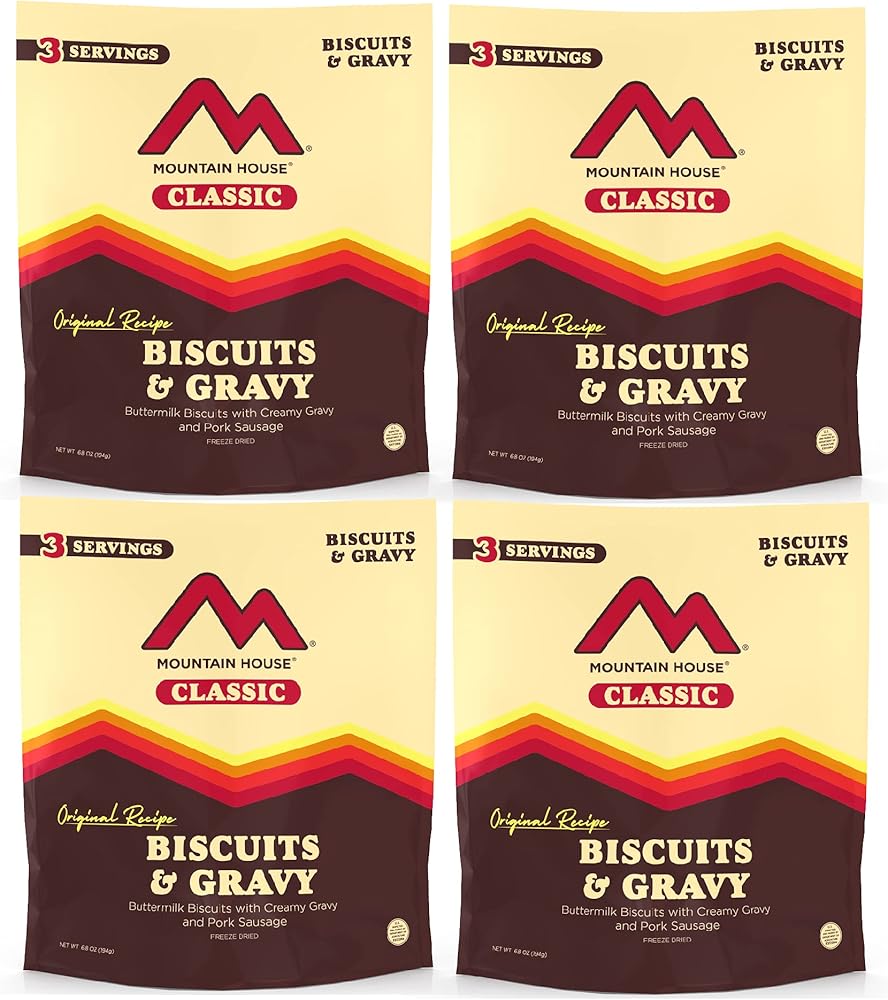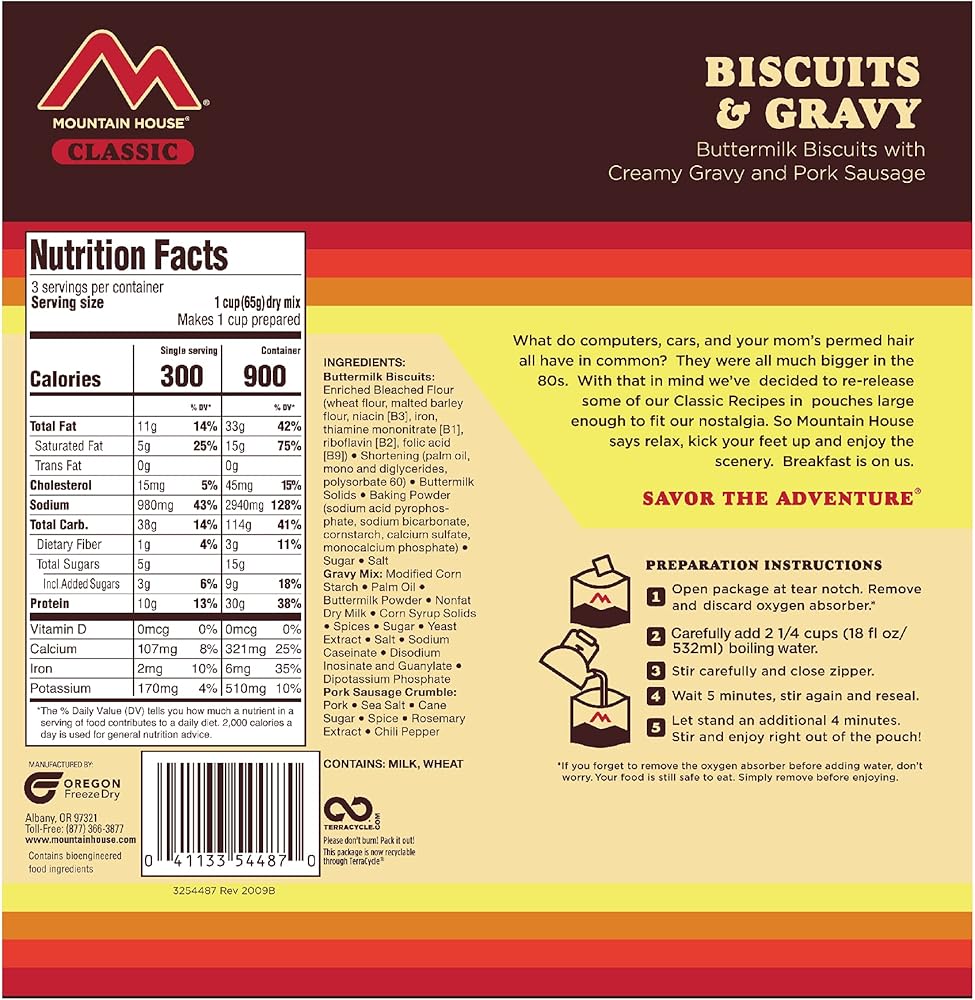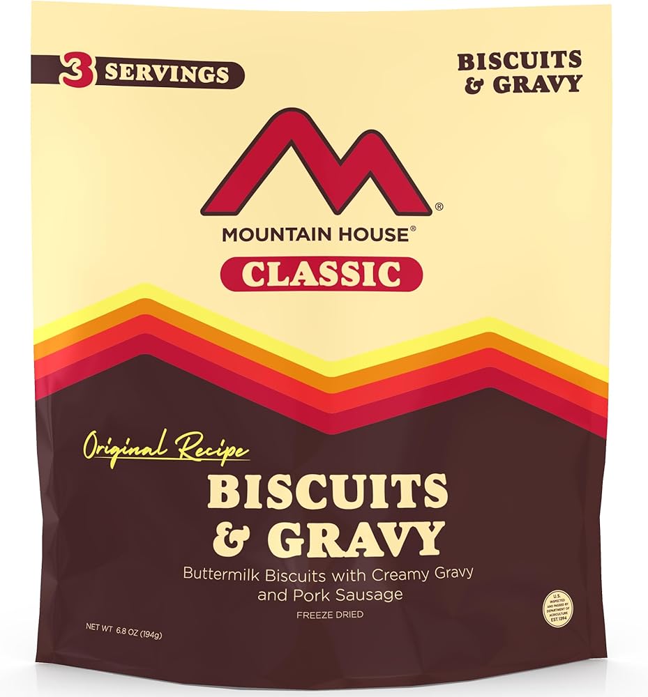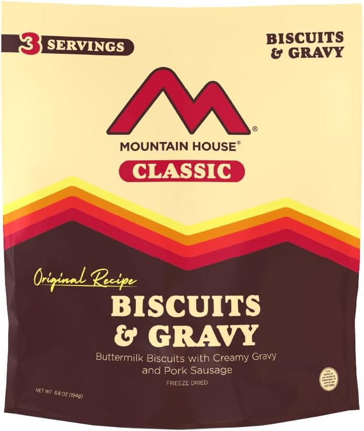 What do computers, cars, and your mom's permed hair all have in common? They were all much bigger in the 80s. With that in mind, we've decided to re-release some of our classic recipes in pouches large enough to fit our nostalgia. Made with buttermilk biscuits with creamy gravy and pork sausage. Just add hot water to the pouch and in less than 10 minutes you'll have a delicious meal you can eat anywhere. Mountain House meals are freeze-dried to lock in nutrients and flavor which also makes our meals lightweight. Plus, with the longest proven shelf life in the industry, add Mountain House to your emergency food supply and have peace of mind for three decades. So Mountain House says relax, kick your feet up and enjoy the scenery. Breakfast is on us.