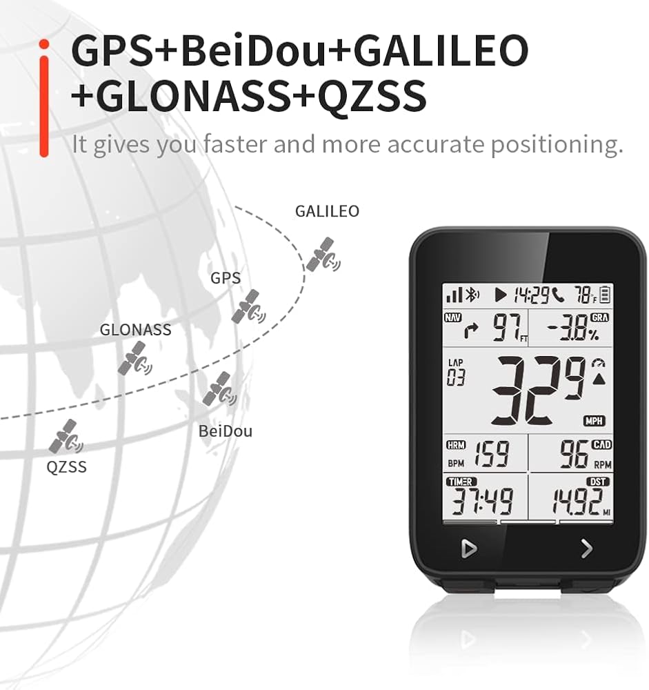 5 أنظمة لتحديد المواقع عبر الأقمار الصناعية: على عكس المنتجات الأخرى التي تحتوي على 2 أو 3 أنظمة للأقمار الصناعية فقط، يحتوي كمبيوتر الدراجة الخاص بنا على 5 أوضاع لنظام تحديد المواقع العالمي (GPS)، وBeiDou، وGalileo، وQZSS، وGlonass، والتي ستكون حساسية أعلى، ودقة أعلى، وتحديد المواقع بشكل أسرع في جميع أنحاء العالم.