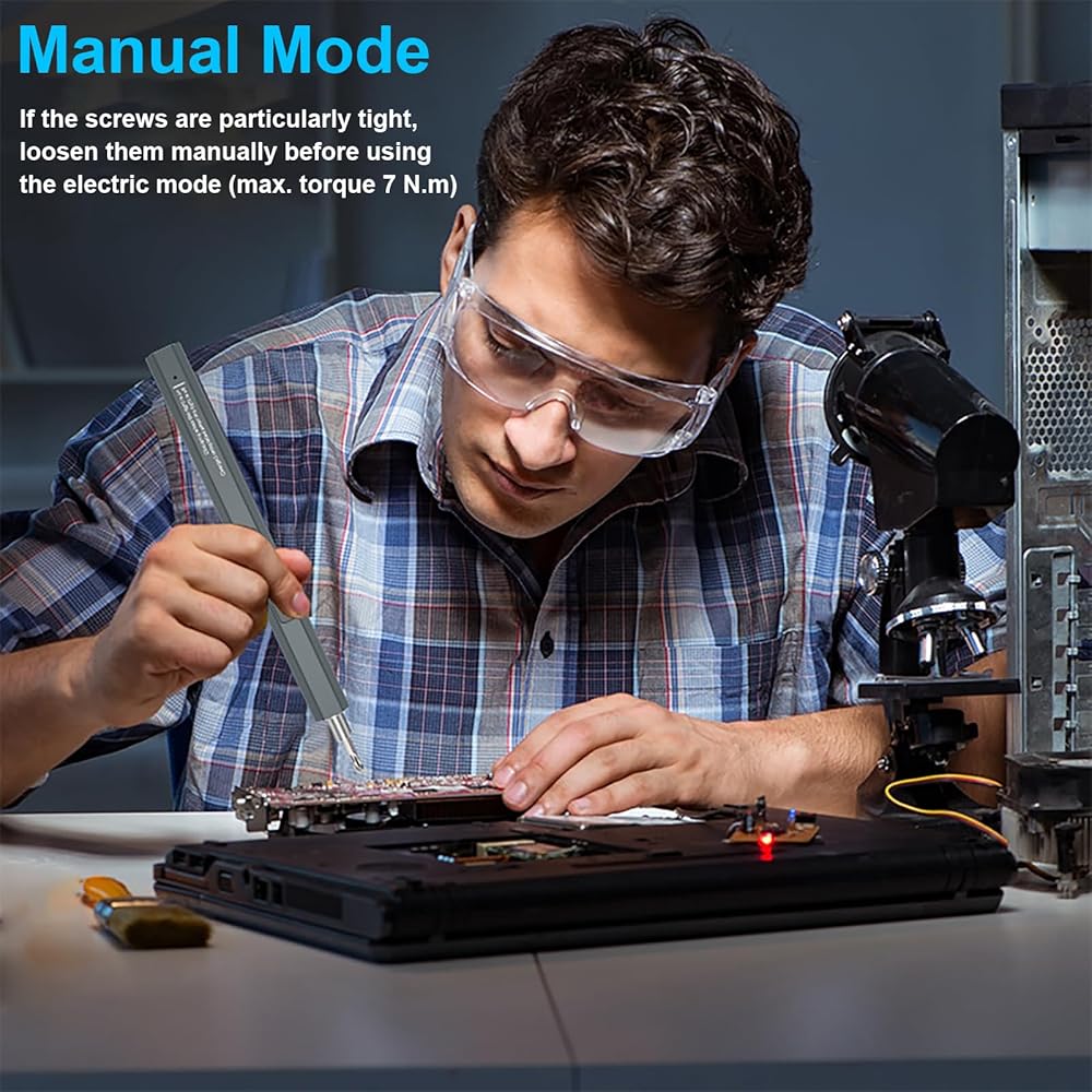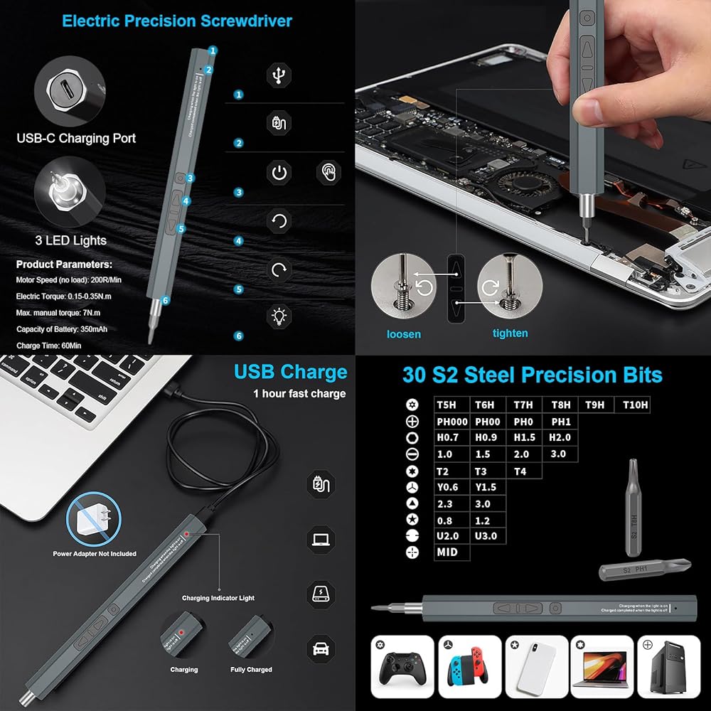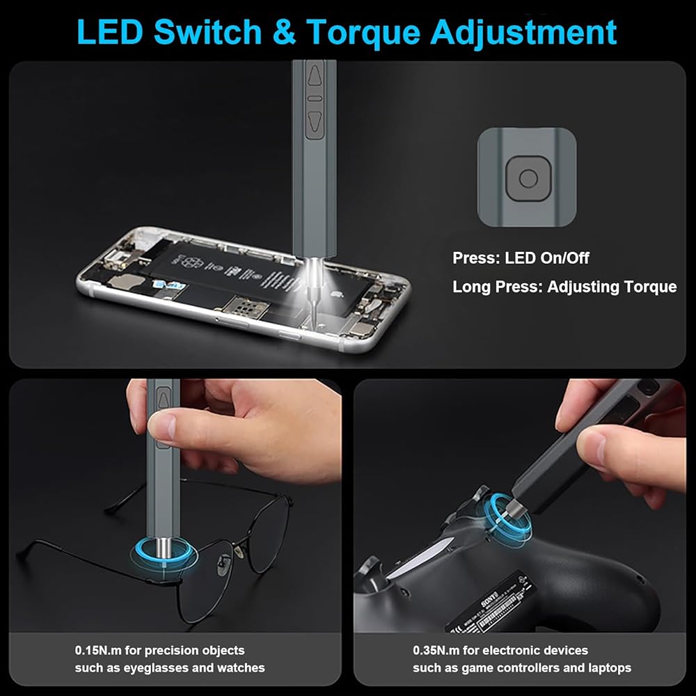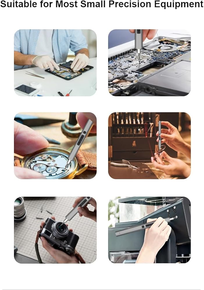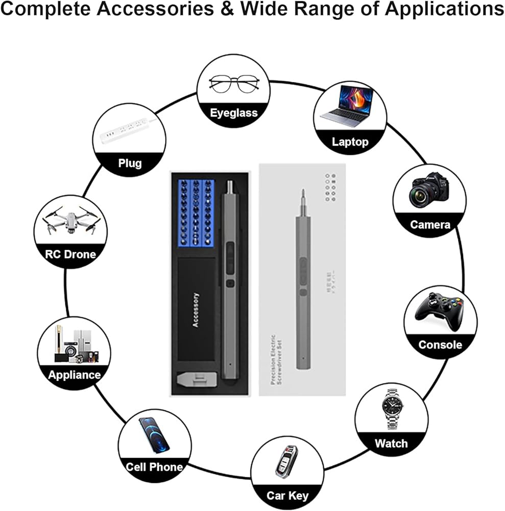 • MULTIPURPOSE: Our mini power screwdriver set is small and compact, but powerful, ideal tool for repairing precision electronics. Equipped with 2 gears torque, making it versatile for repairing a wide range of electronic products, such as computers, laptops, pc, cell phones, game controller, RC drones, camera, watches, and glasses. The drill bits are made of reliable S2 steel material and are CNC machined for a precise fit to ensure durability and effectiveness.