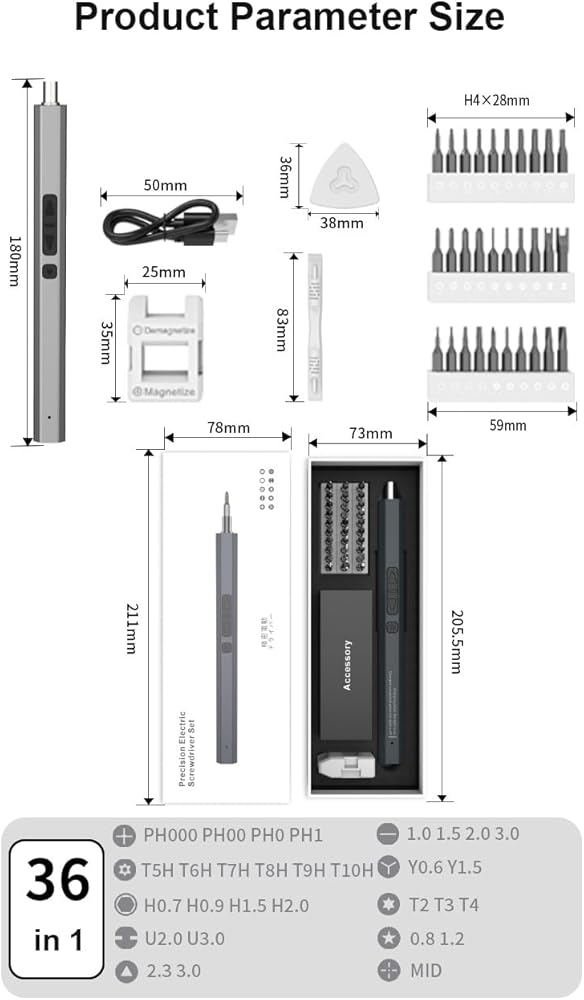 • 36in1 MINI ELECTRIC SCREWDRIVER: The mini cordless power screwdriver set includes 36 units: 30 precision specialty bits, 1 electric screwdriver handle, 1 plastic pry bar, 3 plastic pry pads, 1 usb cable. The electric screwdriver has an electric torque of 0.15-0.35 N.m, a manual torque of 7 N.m and a free speed of 200r/min. (Not suitable for drilling holes, screwing boards, or screwing home improvement screws.)