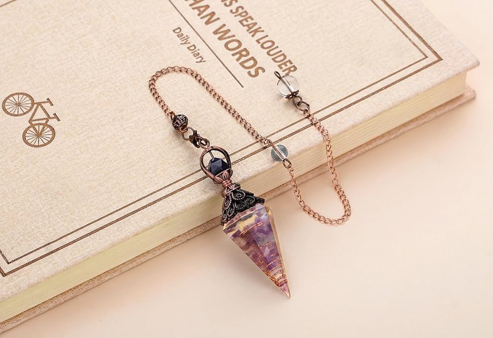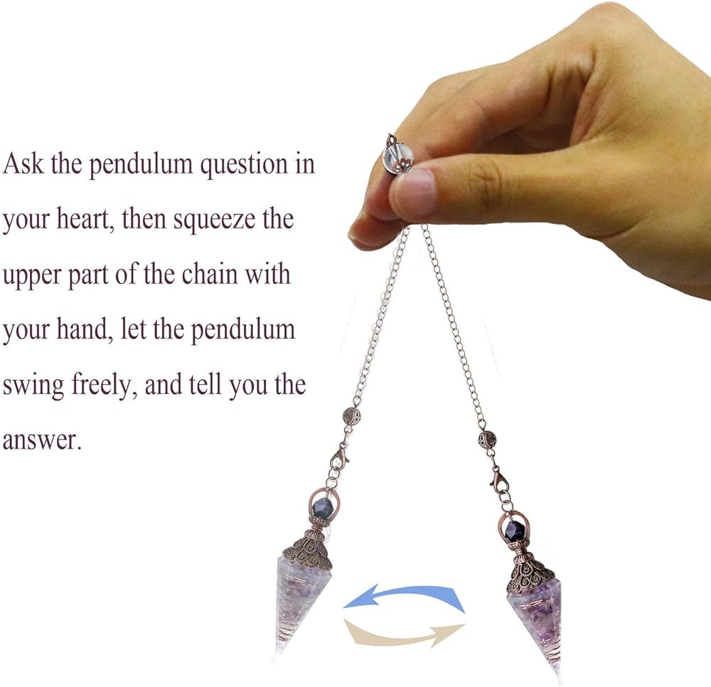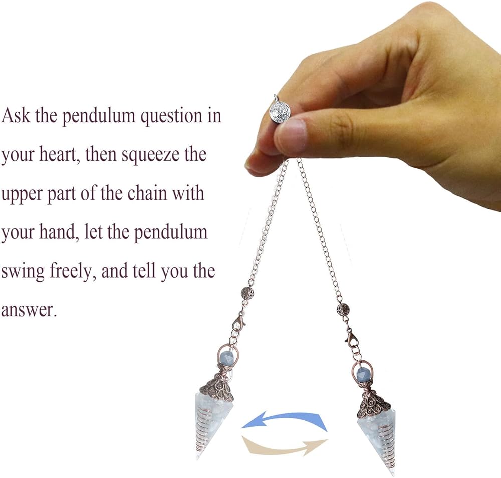 [البندول]: البندول عادة ما يكون عبارة عن بلورات أو أحجار كريمة توضع في نهاية السلاسل أو الحبال. تعتبر البلورات خيارًا ممتازًا للبندول لأنها تمتلك بالفعل ترددات قوية وروحانية عميقة. ويسمى بالبندول بسبب الحركة التي يستخدمها عند تقديم التوجيه، ويتأرجح في اتجاهات مختلفة بناء على الإجابة.