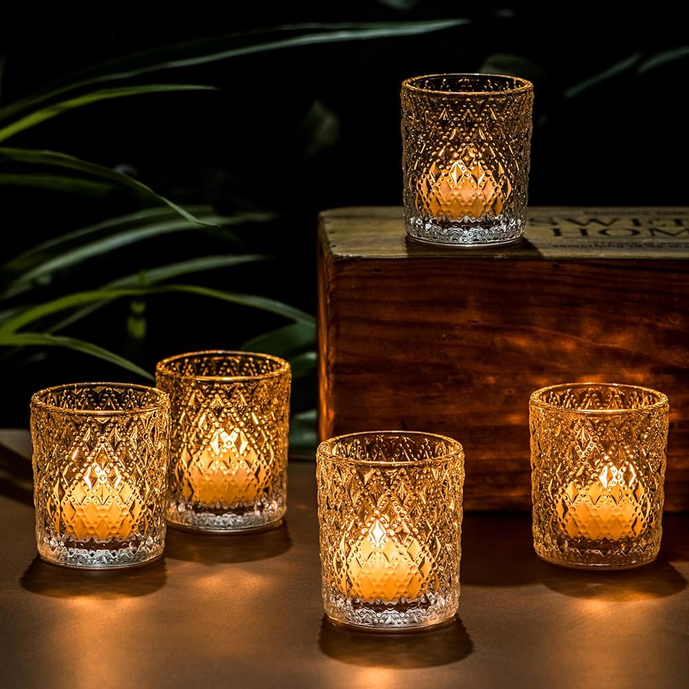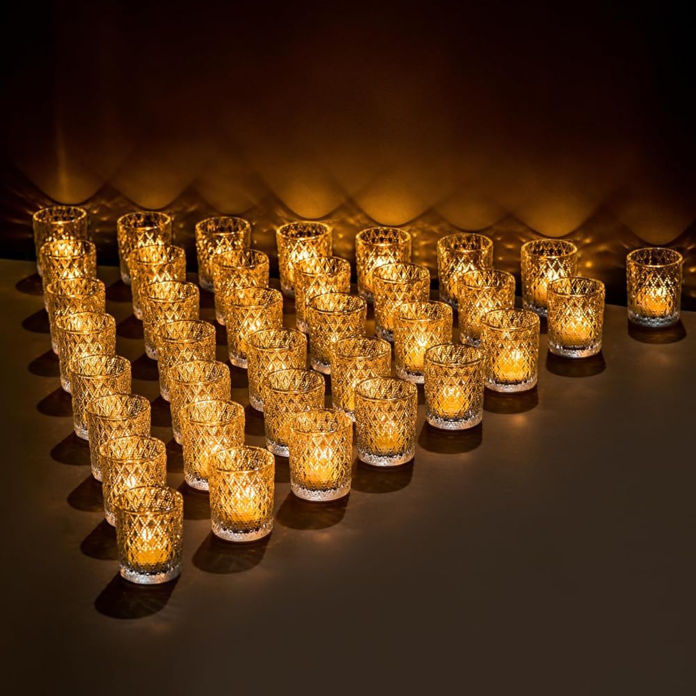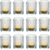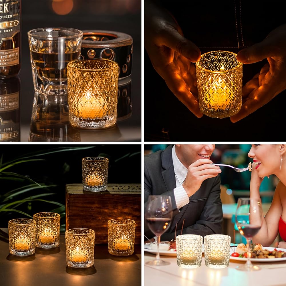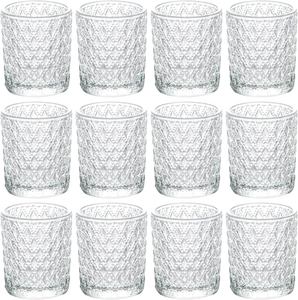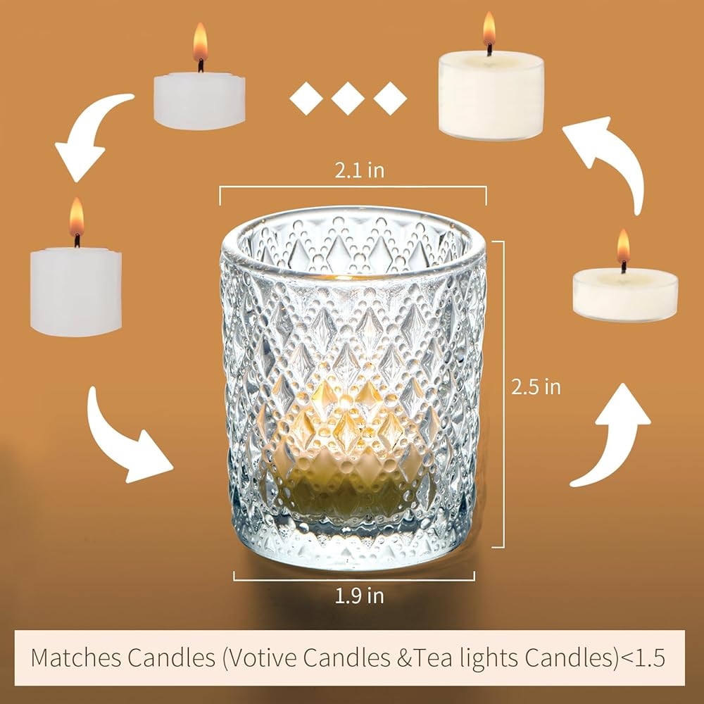 مجموعة حاملات الشموع: توفر مجموعة الشموع الزجاجية 12 قطعة بكميات كبيرة، حاملات شموع الشاي 2.1 بوصة عرض × 2.5 بوصة ارتفاع تناسب شموع الشاي القياسية التي يقل قطرها عن 1.5 بوصة، الحجم المثالي يخلق توهجًا دافئًا وجذابًا يكمل منزلك أو ديكور زفاف أو مناسبة خاصة.
