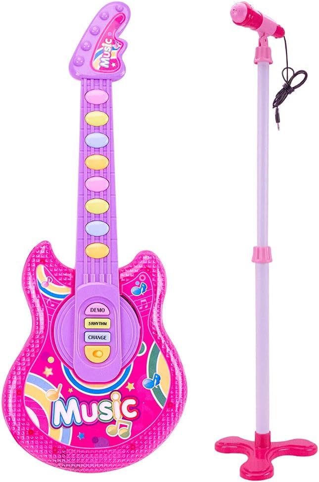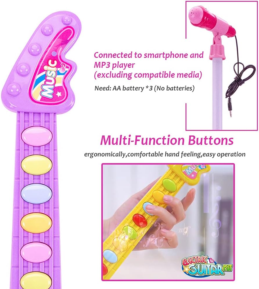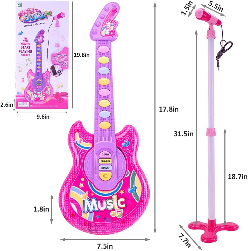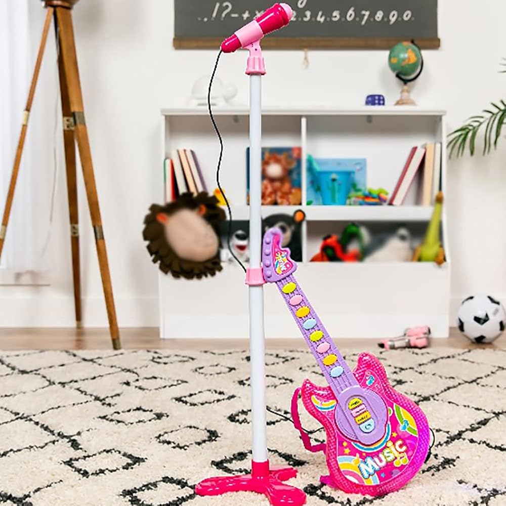 1.【Toy Guitar for Kids】The electric guitar set is equipped with an easy-to-operate guitar, a functional microphone and an adjustable microphone stand, complete accessories, to stimulate children's interest in music