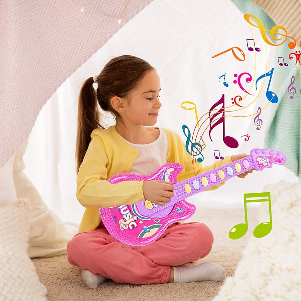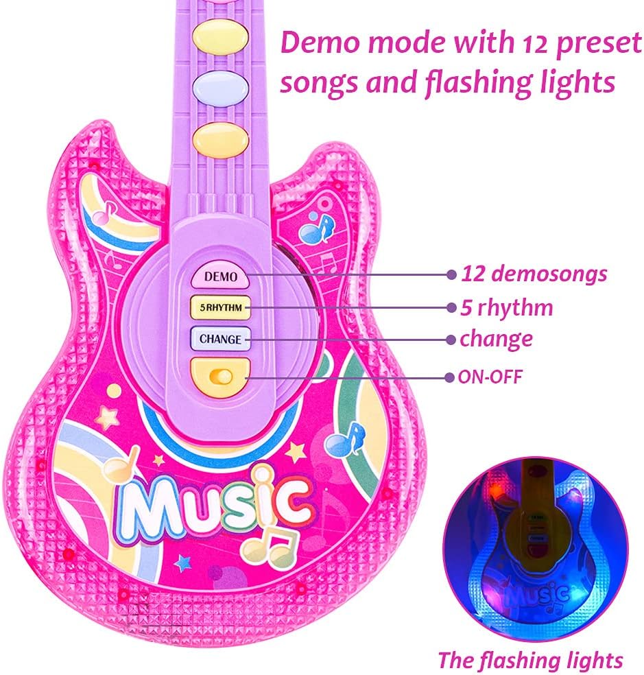 3. 【Multiple Play Mode】Demo mode with 12 preset songs and flashing lights.Kids guitar powered by 3 AA batteries (not included).The guitar can exercise children's finger sensitivity and improve their understanding of music.