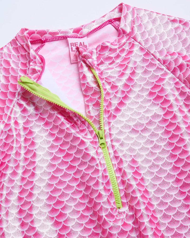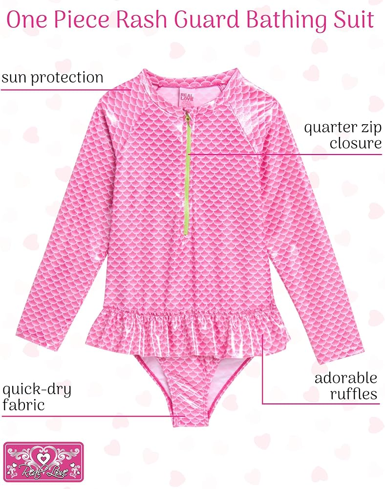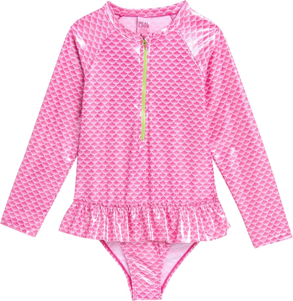 • SUN PROTECTION: Keep your little one safe from harmful UV rays with the Real Love Girls' Long Sleeve Rashguard. Designed with sun protection fabric and long sleeves, this swimsuit provides an extra layer of defense against the sun's harmful rays. Whether she's frolicking in the waves or lounging by the pool, you can relax knowing that she's shielded from the sun's damaging effects. With this swimsuit, sun safety never looked so stylish