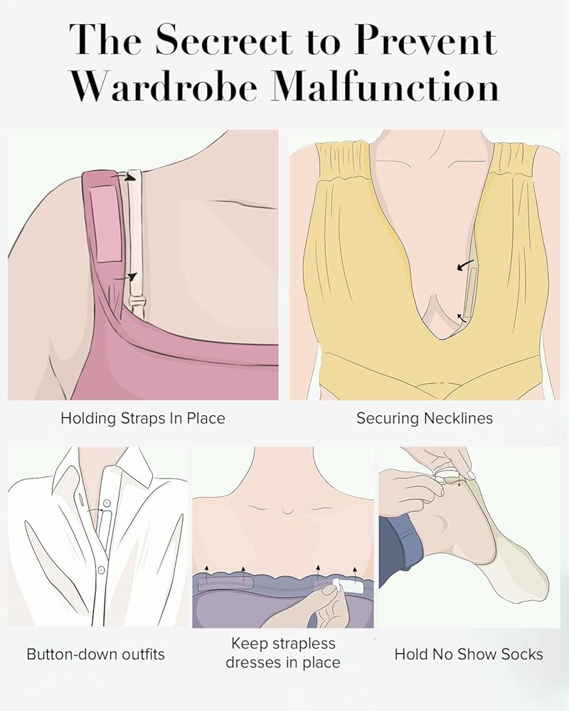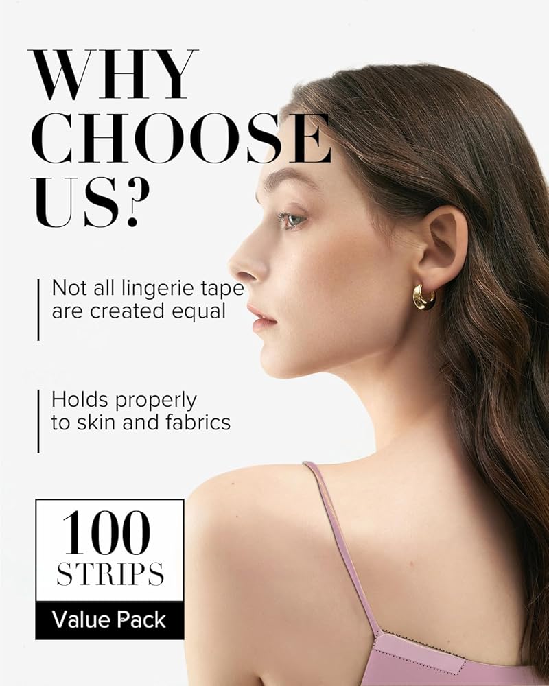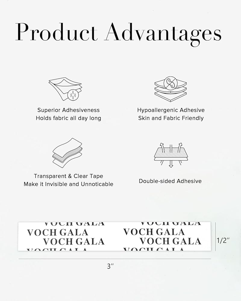 • Secure Adhesion - Our double-sided fashion tape ensures your clothing stays in place, preventing any embarrassing wardrobe malfunctions, whether you're wearing plunging necklines, backless dresses, or strapless tops.