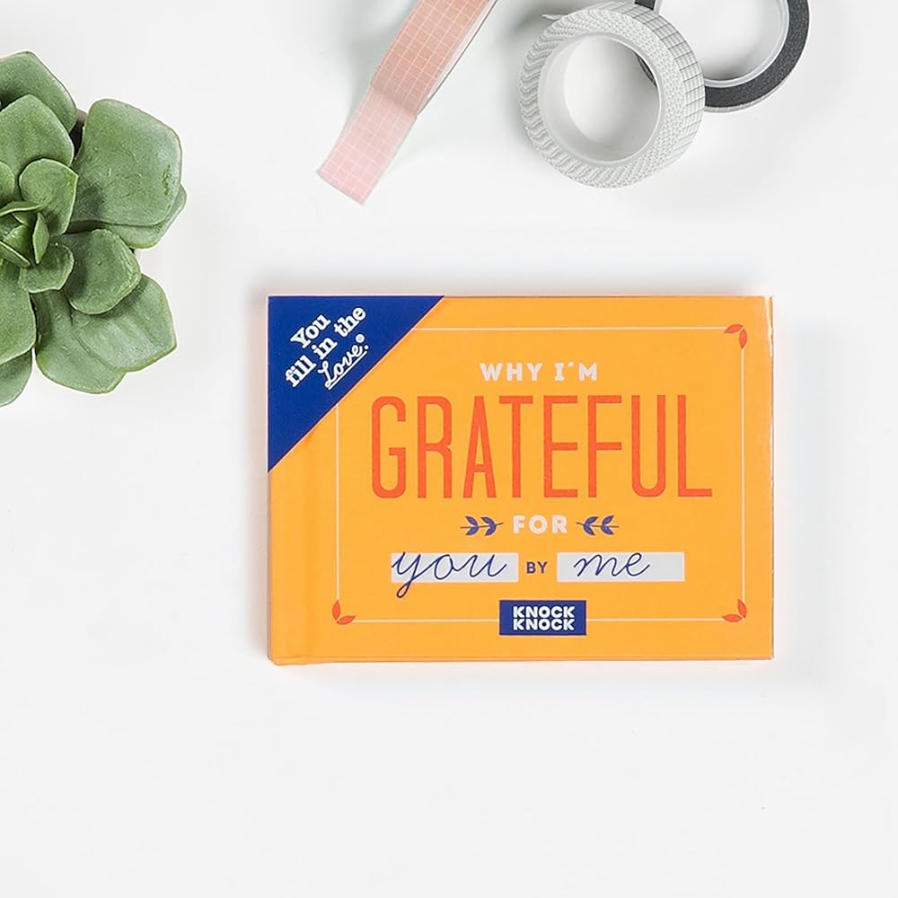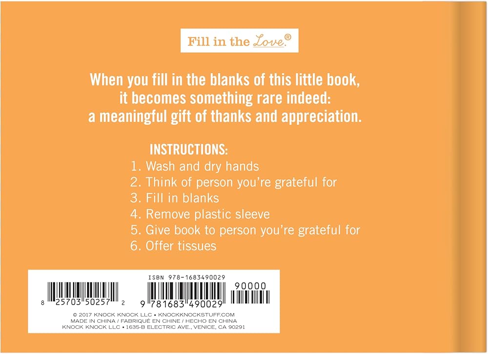 Simply fill in the blanks of this diminutive volume and voilà: it becomes a personalized gift someone you're thankful for will read again and again. Make it as appreciative, affirming, or adorable as you please! Take friendship gifts to the next level with this upbeat baby . Need stocking stuffer ideas for besties, pals, and acquaintances? You're welcome. Hardcover with removable clear plastic jacket; 4.5 × 3.25 inches; 112 pages. Knock Knock is an independent maker of clever gifts, books, and whatever else they can think up. Their mission is to bring humor, creativity, and smarts to everyday life. Knock Knock's crackerjack in-house team creates products and develops books from the ground up - as well as collaborating with outside authors, bloggers, and other creative types. Whether producing sticky notes or a volume of thoroughly researched nonfiction, Knock Knock happily dispenses irreverence, wordplay, and wit from its sunny perch in Venice, California, to folks around the globe. Say something more with #knockknockstuff.