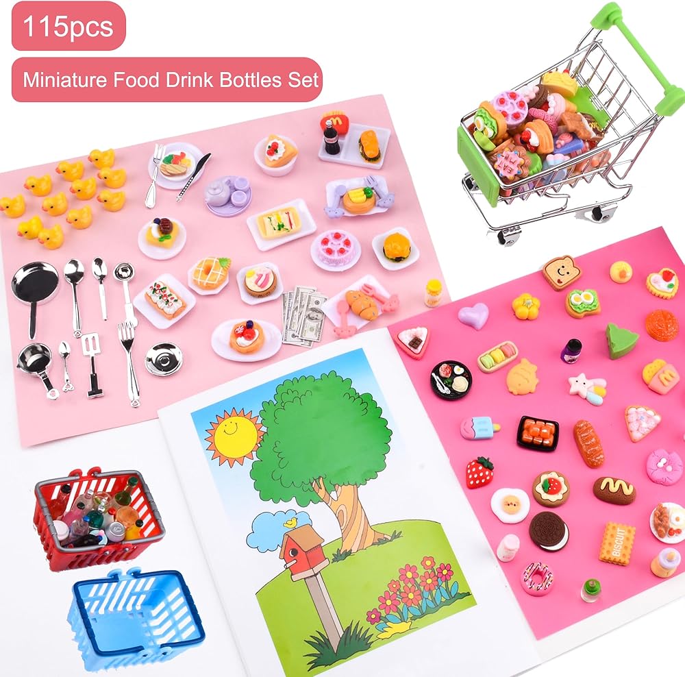 115 Pcs Dollhouse Shopping Accessories: Includes 1 Pcs metal toy shopping cart,2 Pcs mini shopping baskets,74 Pcs miniature food drink bottles,11 Pcs silver cookers,12 Pcs white tableware,4 Pcs tea set,10 Pcs mini yellow resin ducks,1 bundle of paper dollar bill model. It's WYSIWYG, the styles are basically consistent with the picture, not random.
