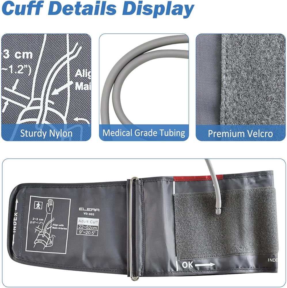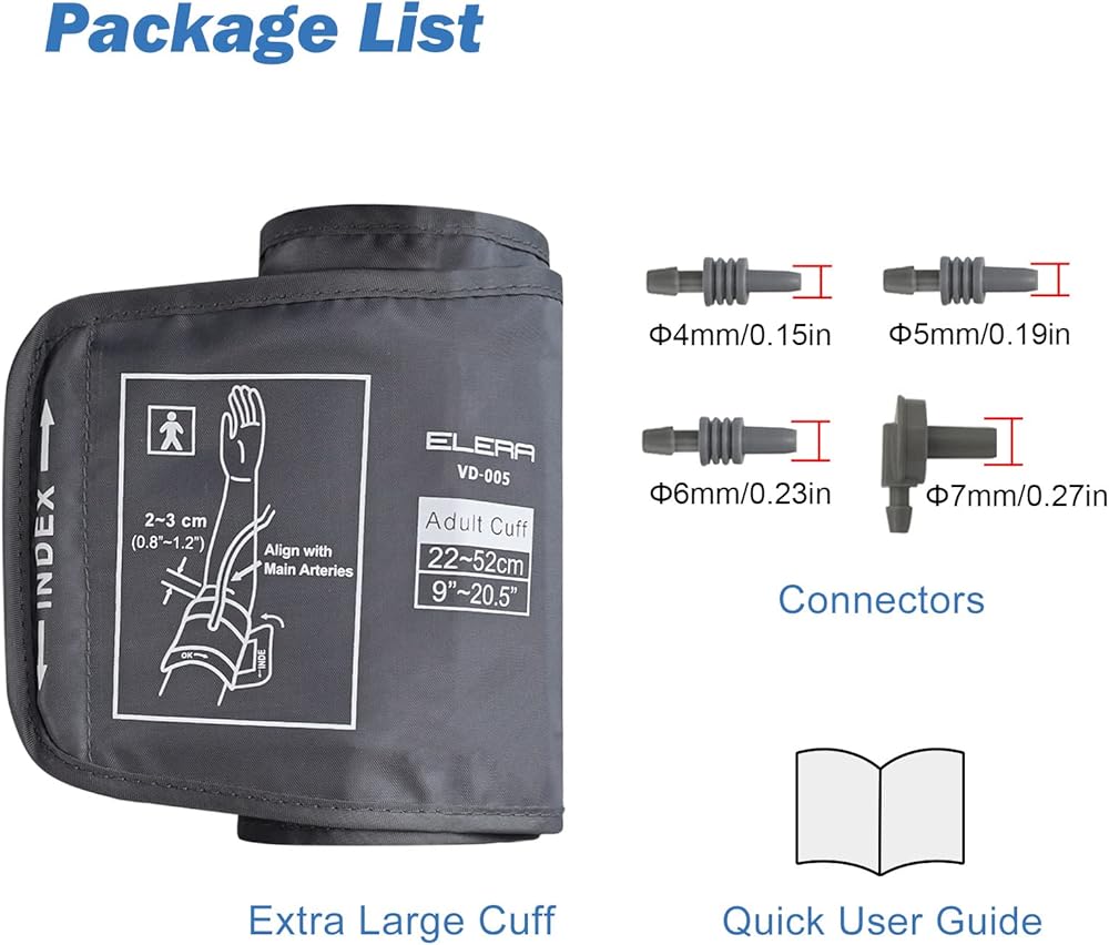 • تصميم متوافق - استبدل أساور مراقبة ضغط الدم البالية أو التالفة بسهولة باستخدام سوار الذراع البديل ELERA. تحتوي الكفة البديلة للذراع العلوي على موصل مستقيم للتوصيل بسهولة بالشاشة الموجودة.