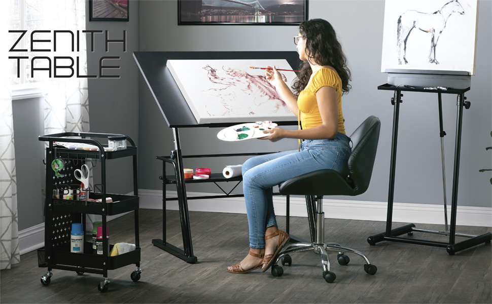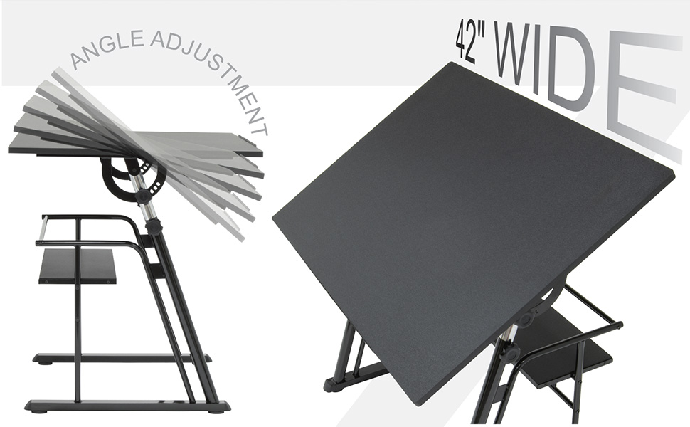 The sleek, modern design of the Zenith Adjustable Drafting Table Studio Desk offers the versatility suitable for various projects. The main work surface of the table top features five adjustable angles, from flat to 40 degrees. The height of the craft table adjusts 6 inches, reaching a maximum height of 38.5''. The Hobby table also includes a 24'' pencil ledge and a spacious storage shelf below. Main work surface of the drawing desk and craft station is: 42''W x 30''D. Overall dimensions: 42''W x 30''D x 32.5''-38.5''H