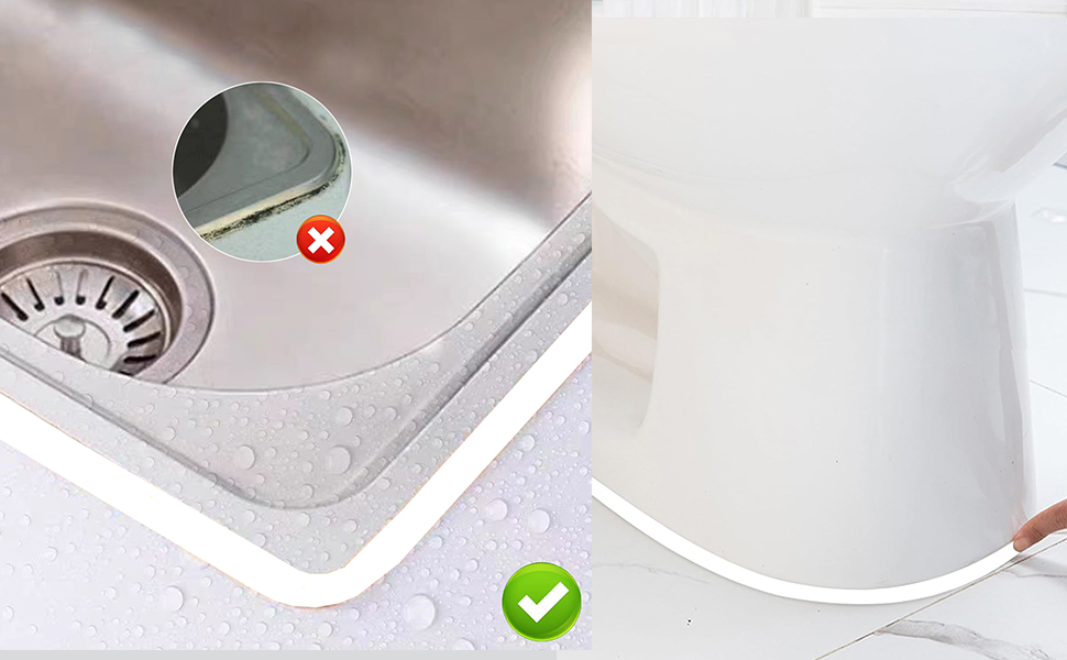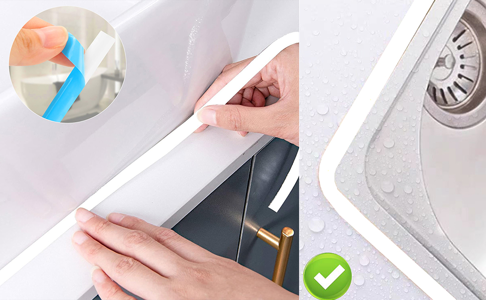 - شريط مانع للتسرب للمرحاض، الحوض، الحوض، الأرضية، الجدار، النافذة، الباب، الزاوية، سطح طاولة المطبخ، إلخ، شريط سدادة المرحاض،