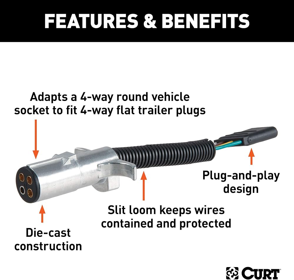 • VERSATILE DESIGN. This trailer wiring adapter makes it easy to connect a mismatched vehicle socket and trailer plug, adapting your 4-way round connector into a standard 4-way flat socket