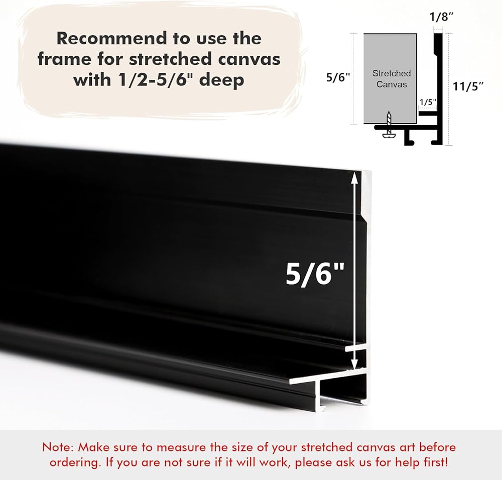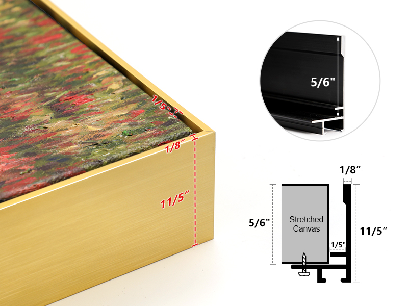 إطار عائم للأعمال الفنية المشدودة - مصمم للأعمال الفنية المطبوعة أو المطلية على القماش، وهي طريقة تأطير خاصة لمنح الفن وهم الطفو داخل الإطار دون لمسه. عمق الأرنب: 0.83 سم، يعمل بشكل جيد مع العمل الفني القماشي المغلف بعمق 0.5-0.8 سم. توجد فجوات بقياس 0.2 بوصة على كل جانب لإنشاء تفاصيل مرئية مثيرة للاهتمام وإحساس بالعمق ثلاثي الأبعاد في الشاشة الشاملة. 【ملاحظة: المقاسات المدرجة تعتمد على اللوحة القماشية المناسبة】