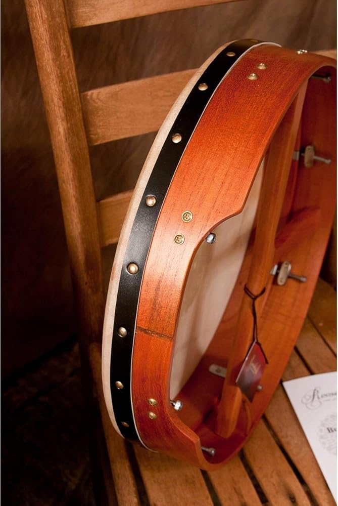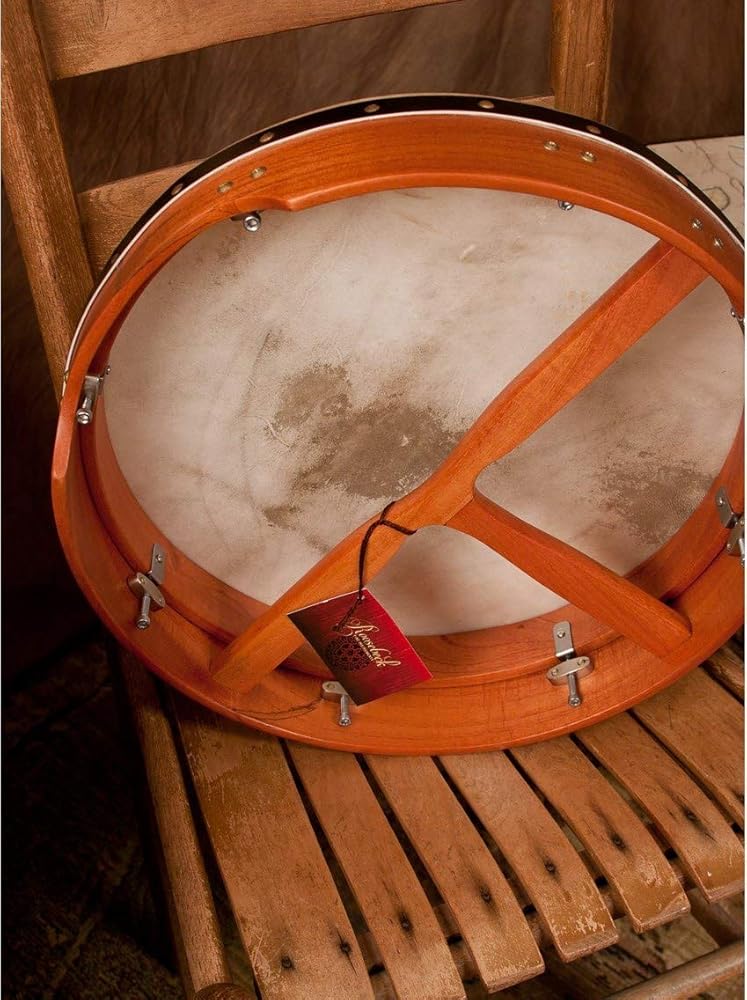 16"x 3.5" bodhran. Primary rhythmic accompaniment for Celtic and Irish music. Contains a goatskin head with the Roosebeck logo and a beautiful red cedar frame that has a black band around it. Player is able to tune drum by adjusting hardware hidden inside. Equipped with a removable t-bar to help support hand and wrist when applying pressure to head from inside of frame. Includes tipper and tuning tool.