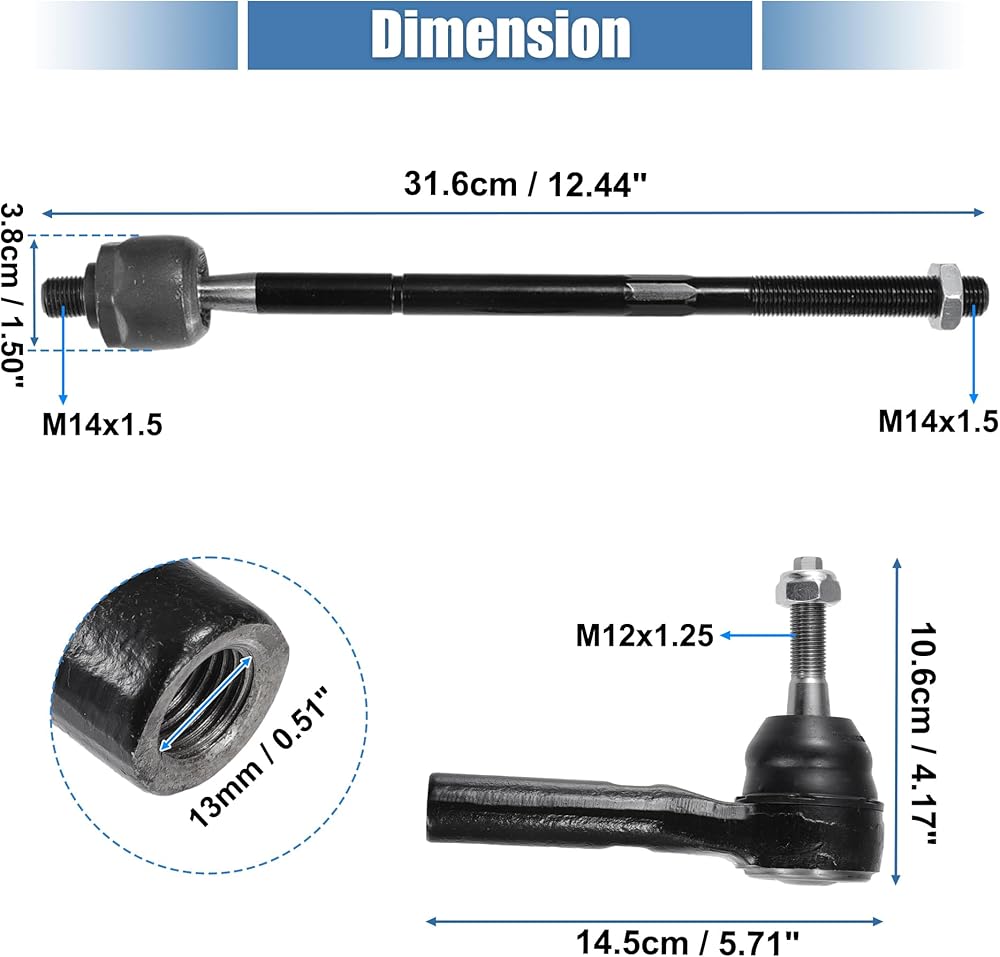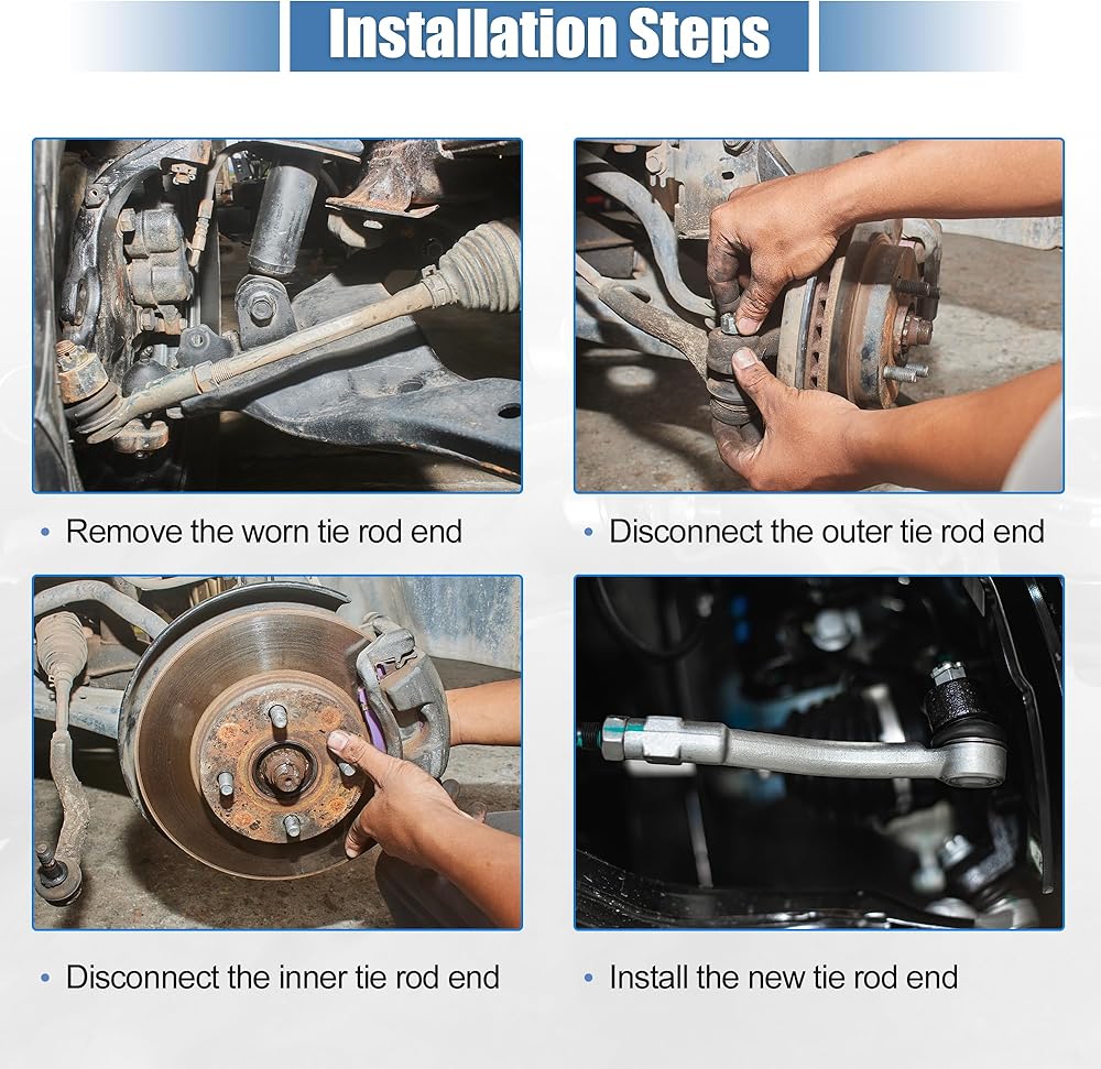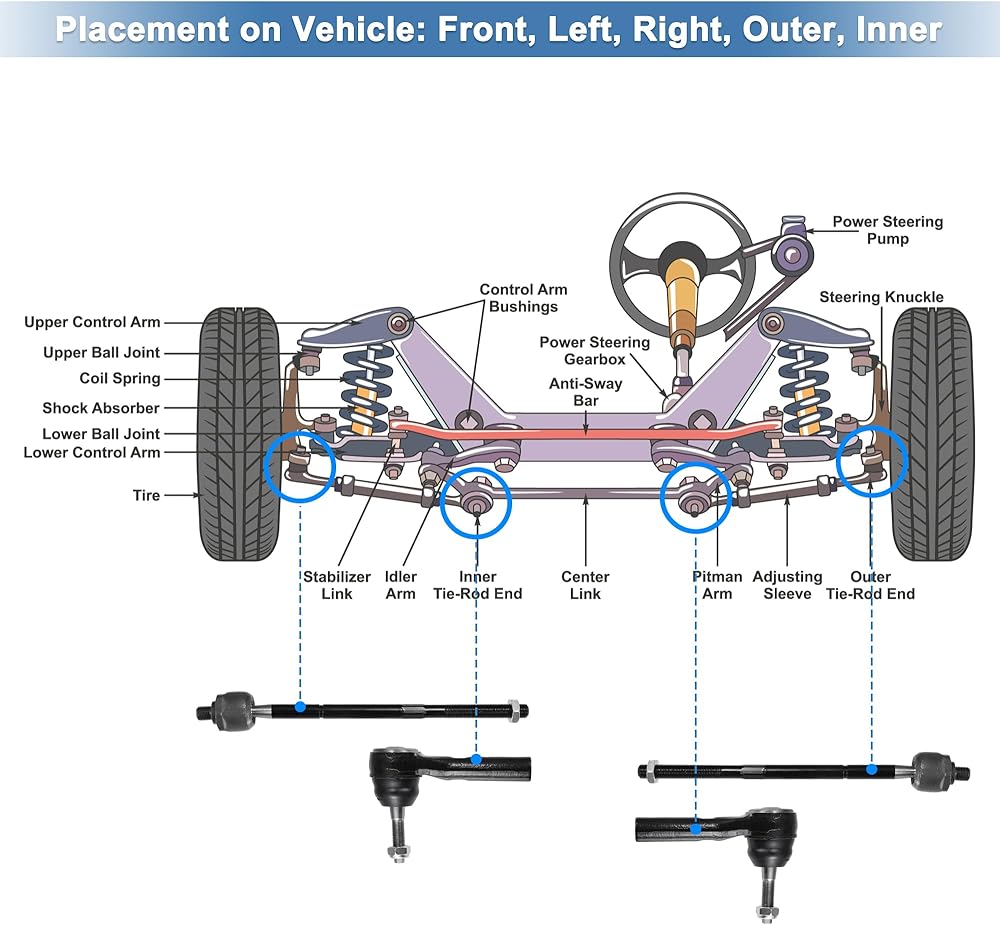 الوضع على السيارة: أمامي، داخلي، خارجي، يسار، يمين. تتضمن الحزمة: 2 قطعة من أطراف قضيب الربط الخارجي الأمامي، 2 قطعة من أطراف قضيب الربط الداخلي الأمامي.