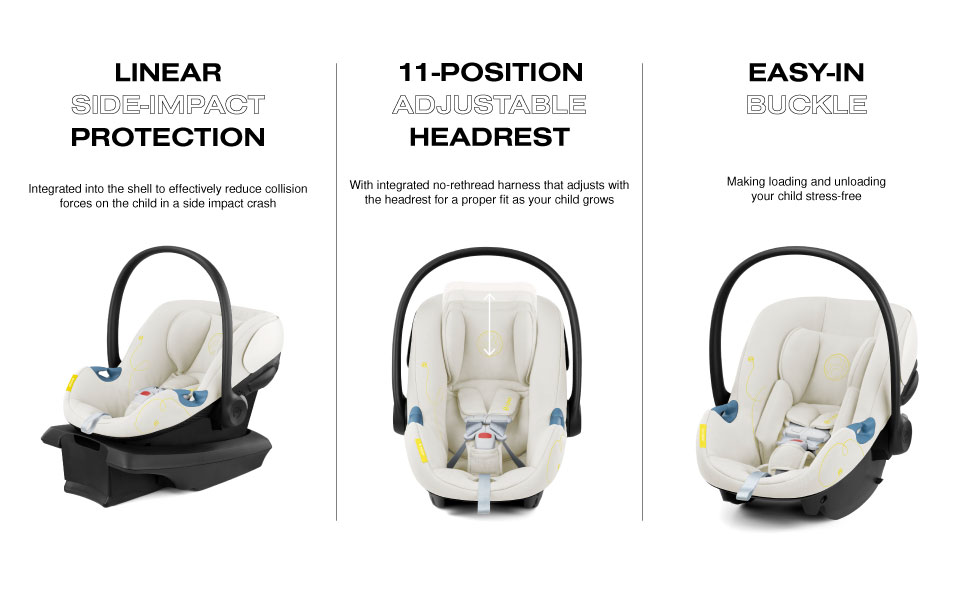 • LINEAR SIDE IMPACT PROTECTION: integrated into the shell effectively reducing collision forces on the child in a side impact crash