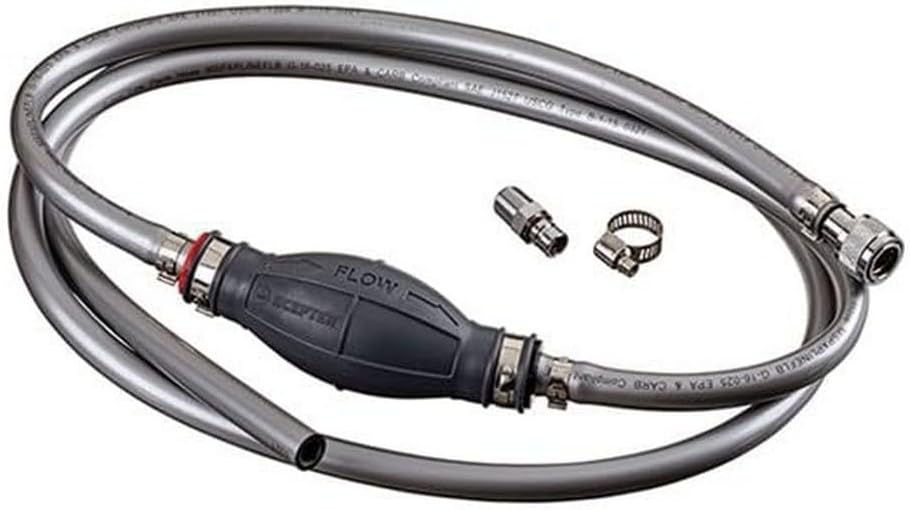 Scepter's 11522, Universal Marine Tank Fuel Line Assembly Kit, 3/8" Universal kit includes 7 foot fuel hose with primer bulb. 3/8" Female tank to hose fitting. A quick connect 1/4" Male NPT Fuel tank fitting and 2 stainless steel clamps. This complete fuel line kit just needs a correct engine connector to have a complete tank to engine system. Marine tank Fuel line assembly kit for assembling fuel tank to boat engine.