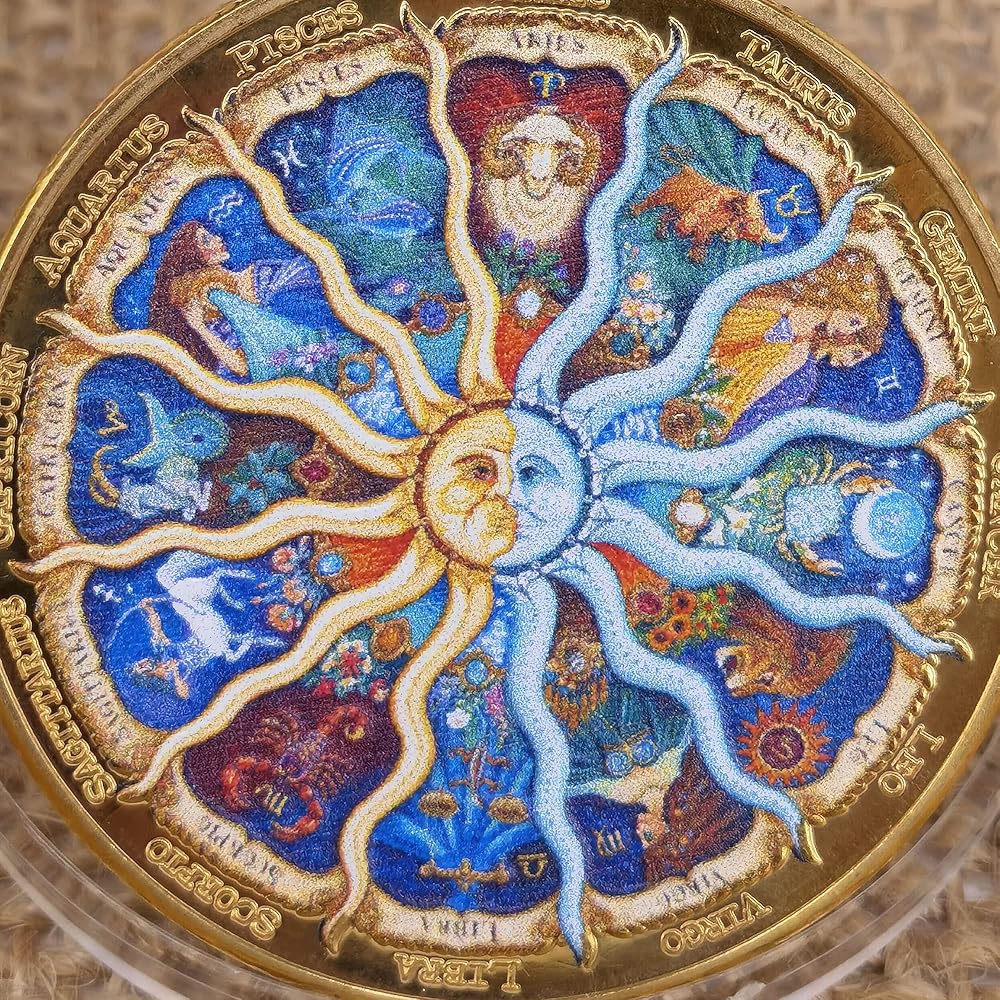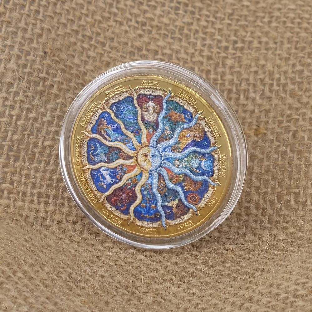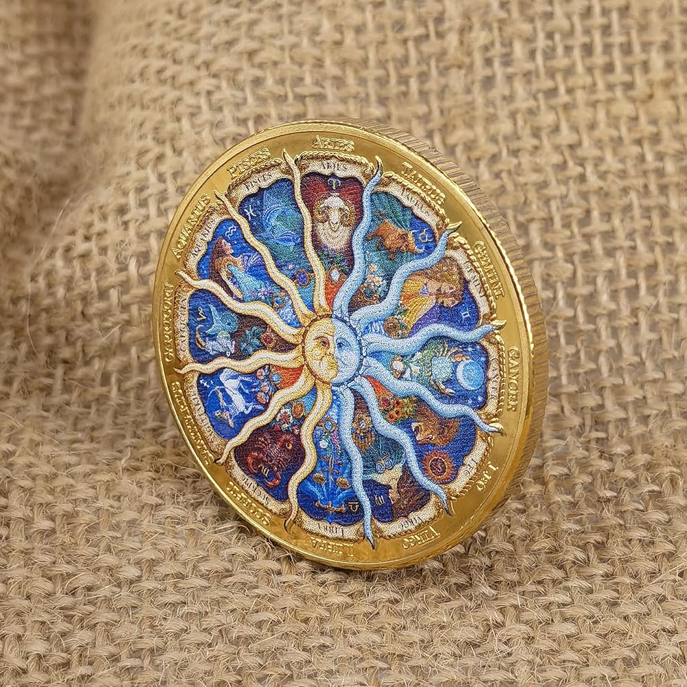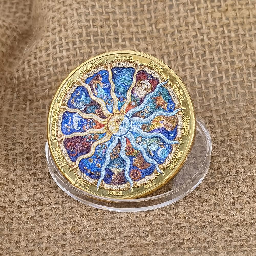 ➤Vibrant Zodiac Design: This 1.57-inch diameter coin features a stunningly detailed and colorful representation of the twelve zodiac signs, accompanied by their corresponding names, creating a visually striking and appealing design.