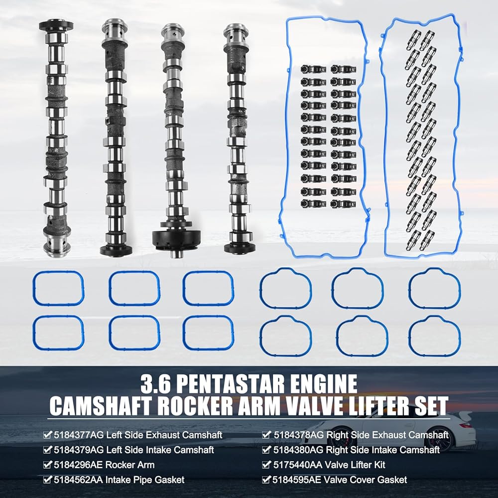 • 【3.6 Pentastar Engine Rebuild Kit】05184377AF, 5184377AG Left Side Exhaust Camshaft | 05184378AF, 5184378AG Right Side Exhaust Camshaft | 05184379AF, 5184379AG Left Side Intake Camshaft | 05184380AF, 5184380AG Right Side Intake Camshaft | Rocker Arm:5184296AE, 5184296AF, 5184296AH | Valve Lifter Kit:5175440AA, 5184332AA, 6420500080, A6420500080 | Intake Pipe Gasket: 5184562AA, 5184331AC | Valve Cover Gasket: 5184595AE, 5184596AE.| 3.6 camshafts rockers lifters kit with black induction ring.