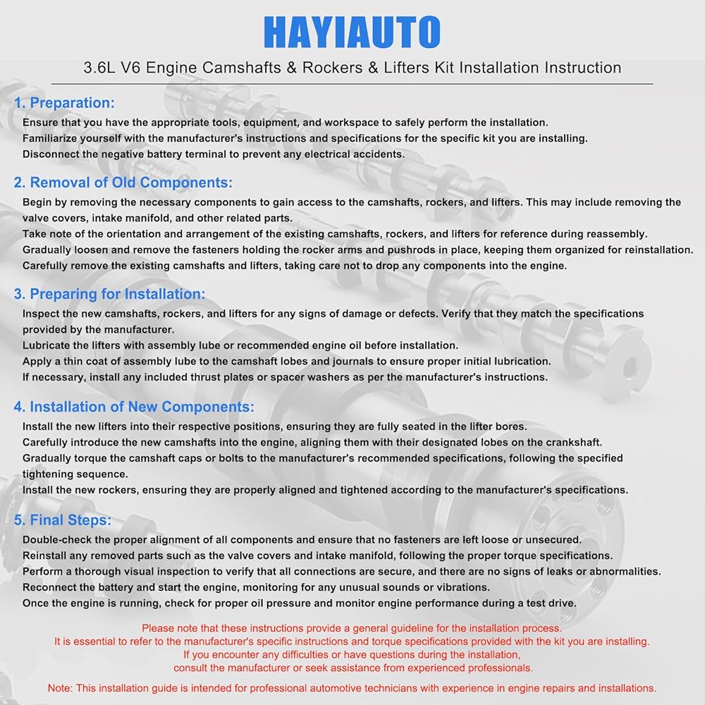 • 【Durable Construction】This 5184377AG/5184378AG/5184379AG/5184380AG camshaft kit is constructed using high-strength materials. With its durable build, the camshaft is able to resist impacts and endure your truck's tough driving performance. HAYIAUTO 3.6L V6 Engine Camshafts Rockers Lifters Kit won't easily wear or break even when exposed to extreme driving conditions.Each component is designed to meet or exceed OEM standards, ensuring reliable performance and durability for your engine.