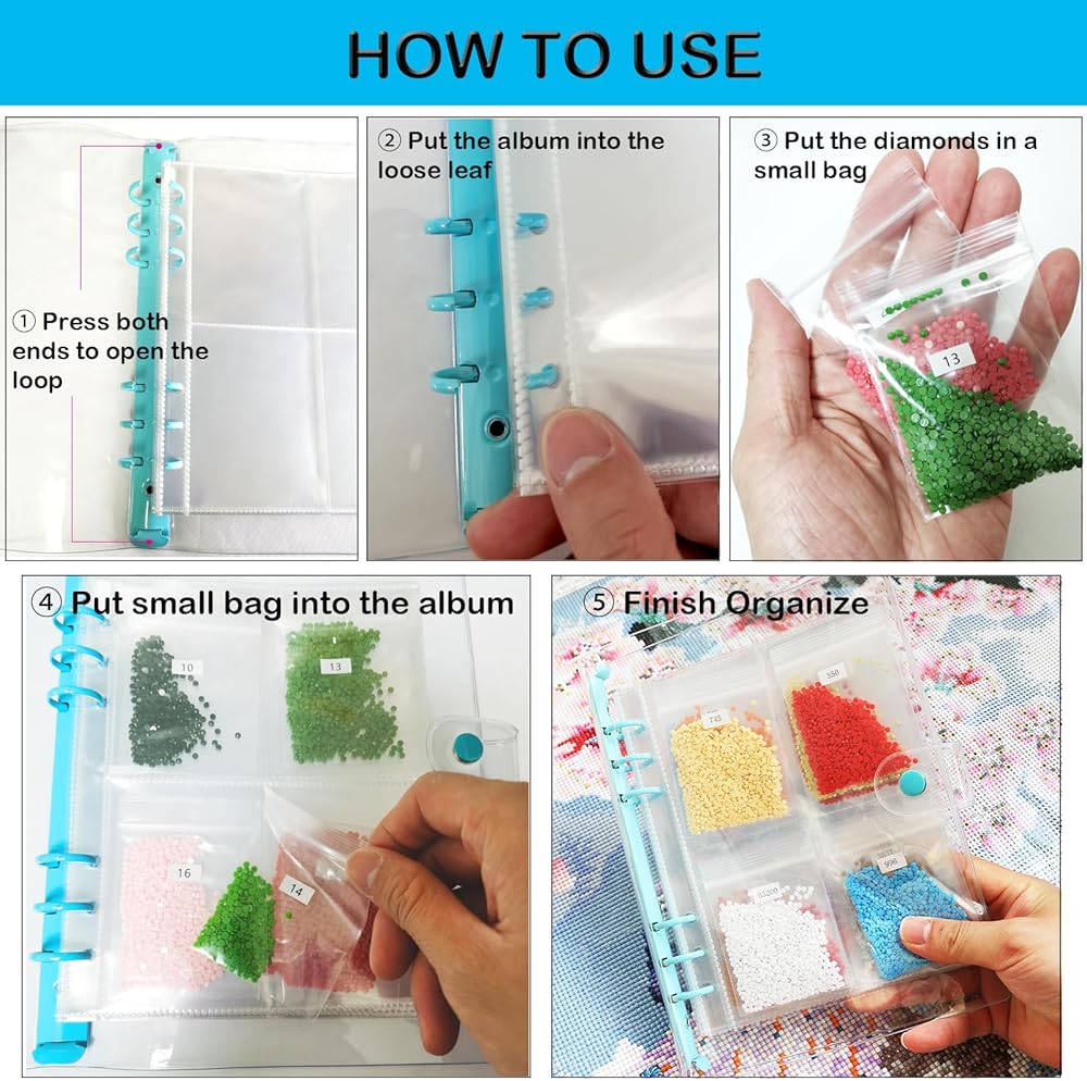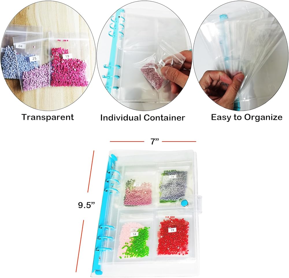 سوف تحصل على: مشبك تخزين شفاف، 10 أوراق من 4 صفحات داخلية (إجمالي 40 شبكة)، 100 قطعة من الحقائب، 3 قطع من الملصقات. قل وداعًا للفوضى، يمكنك تسمية كل حقيبة بالرقم والرمز المطابقين لتسهيل العثور على الماس الصحيح الذي تحتاجه.