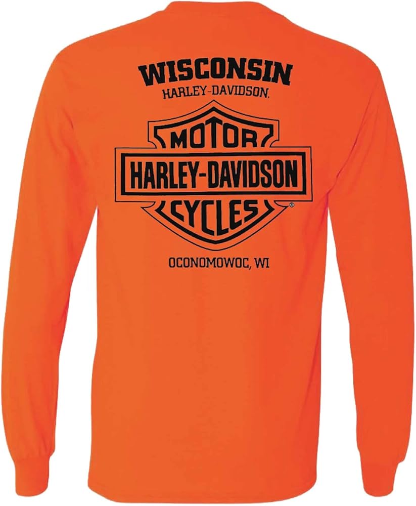 Harley-Davidson Men's Mirror Long Sleeve Shirt - Orange, 40290632. Awesome bold Harley-Davidson script printed in reflective ink. Back features our Wisconsin Harley-Davidson Dealer logo. Classic crew-neck style, traditional comfort fit. Soft and comfortable, made from 50% cotton and 50% polyester. High-quality shirt, holds its shape with every wash and wear. 40290632