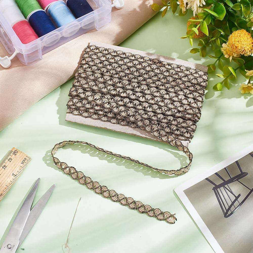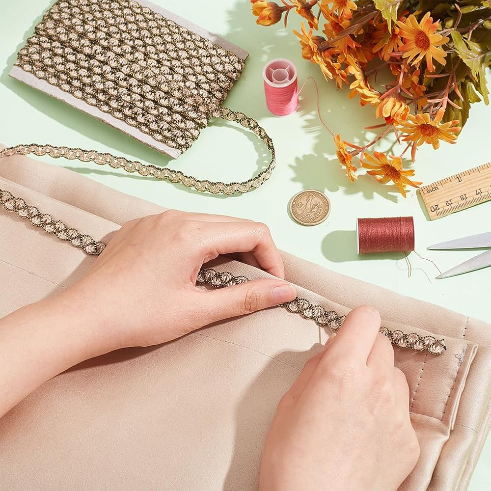 تصميم دانتيل مموج ذهبي: حافة دانتيل مموجة باللون الأسود والذهبي المعدني تتميز بدانتيل مموج ذهبي جديد وتصميم متقاطع بخيط أسود، مضفر بخيط بوليستر ذهبي. منسوجة بإحكام ومصنوعة بشكل رائع.