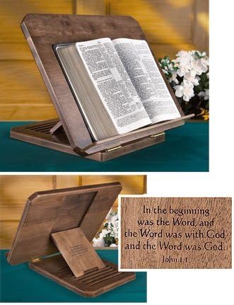Handcrafted maple hardwood bible stand with John 1:1 Bible verse - In the beginning was the Word and the Word was with God and the Word was God. The stand adjusts to 6 levels and is finished in a low-sheen varnish. Some assembly required.