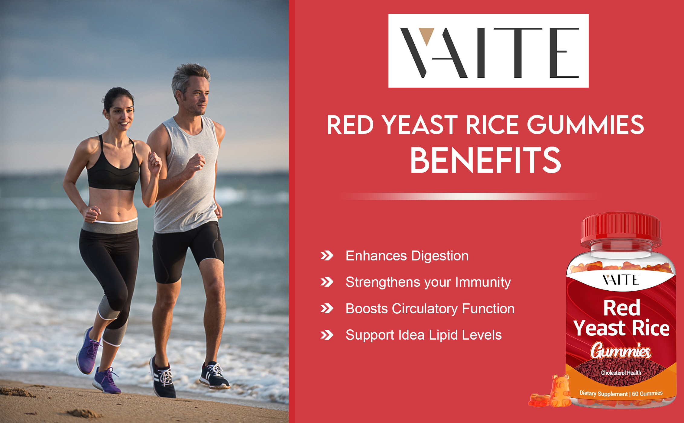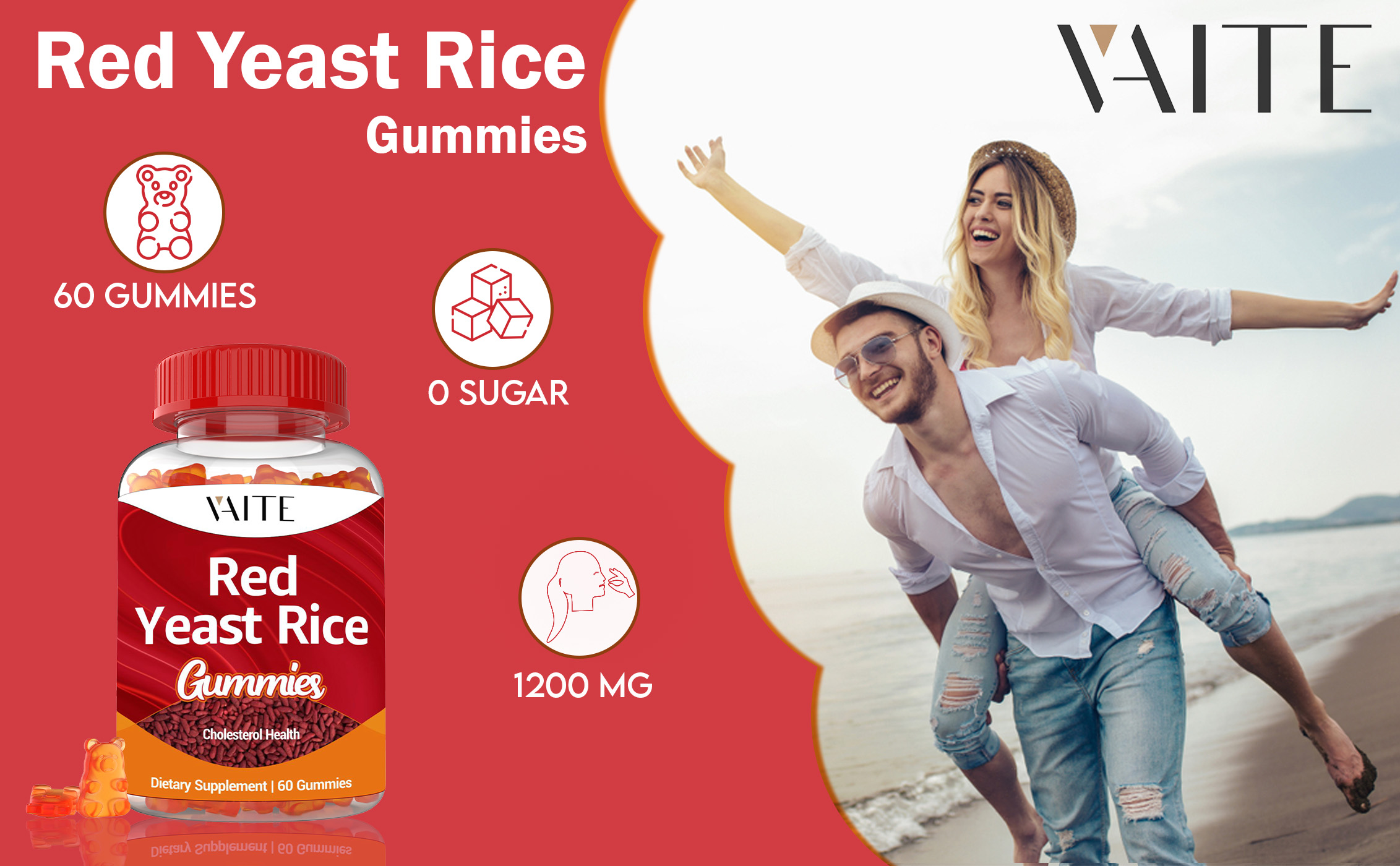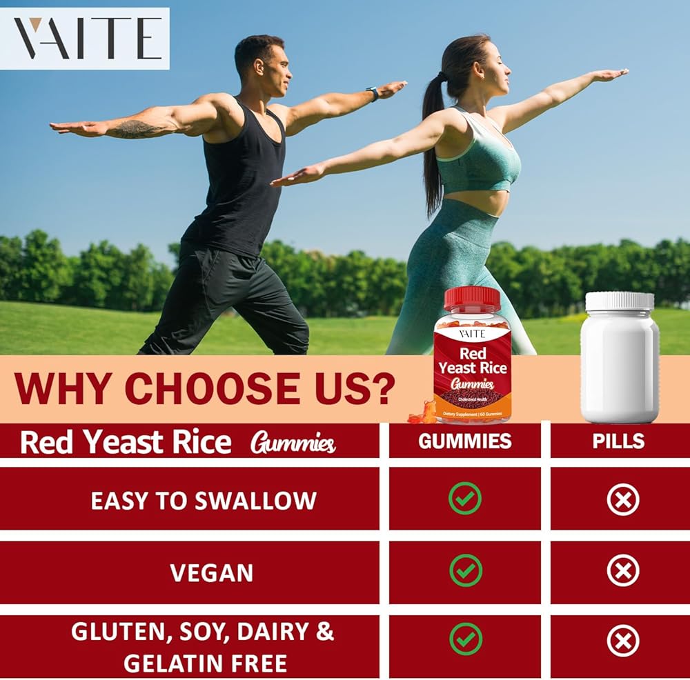 VAITE أرز الخميرة الحمراء مع Coq10 Gummies - 1200 مجم RYR مكمل عضوي مع الإنزيم المساعد Q10 Monacolin K لارتفاع نسبة الكوليسترول وغير معدل وراثيًا وخالي من السيترينين، مضغ عشبي نباتي 60 قطعة