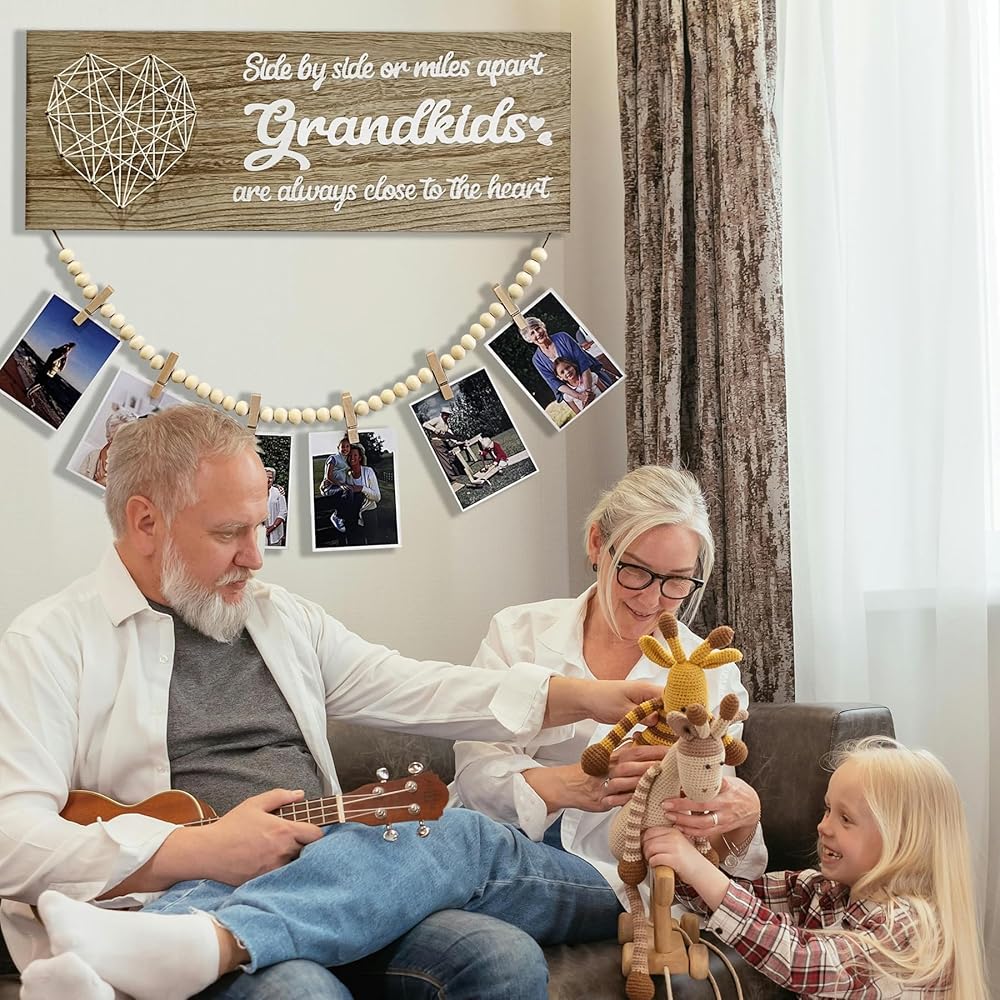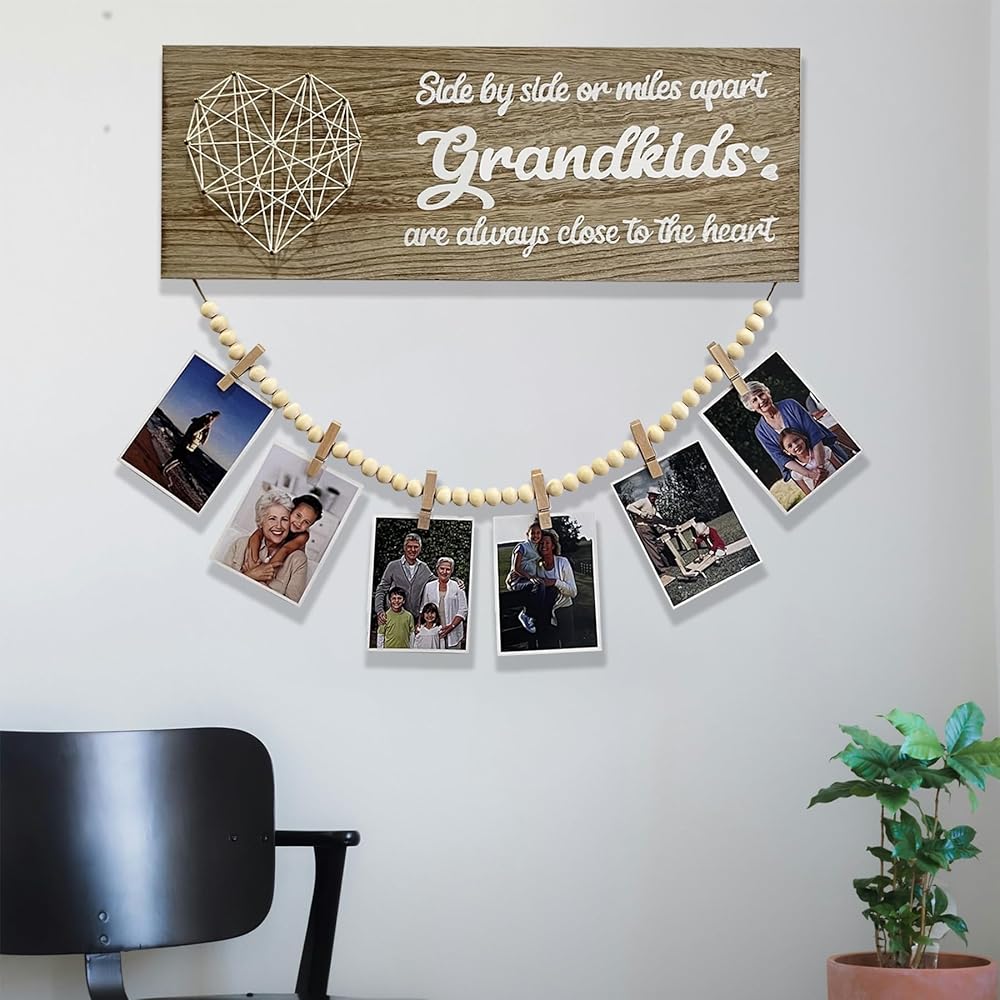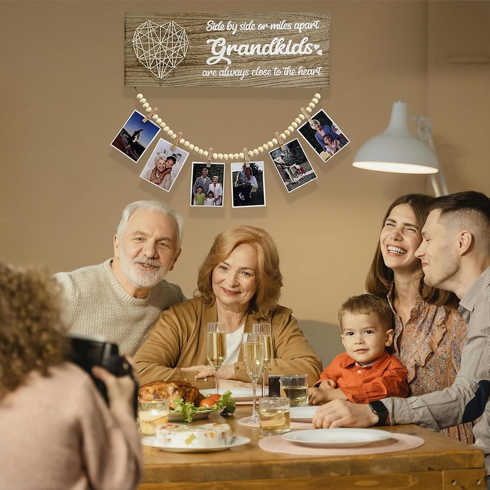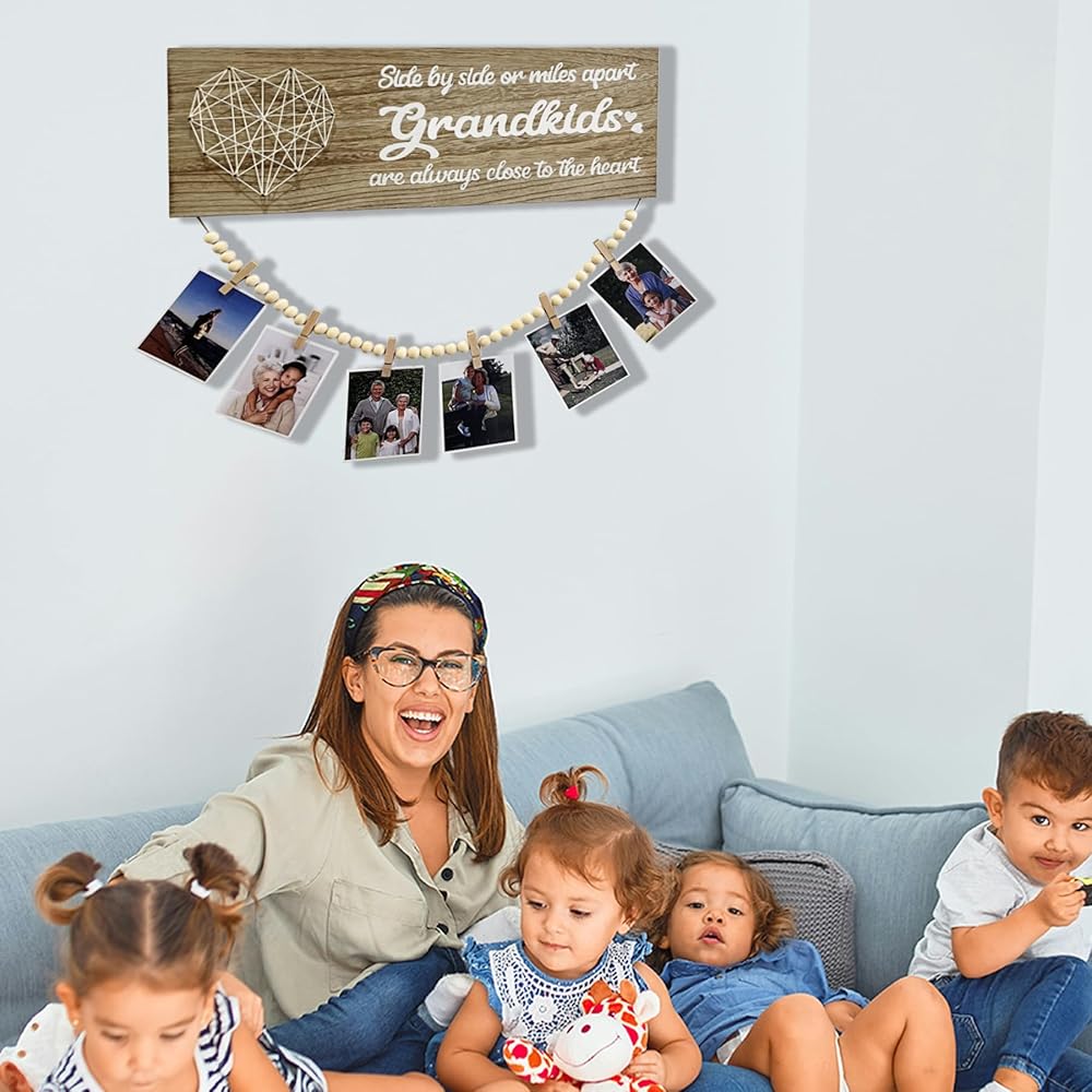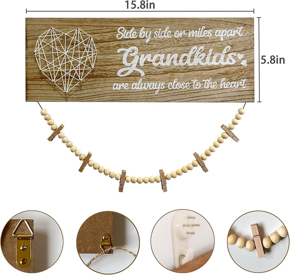 حجم مثالي وسهل التركيب: يبلغ مقاس لوحة العرض المجمعة لهدايا عيد الميلاد/الكريسماس هذه 15.8 × 5.8 بوصة مع 38 خرزة خشبية، و6 مشابك، يمكنك عرض صور أحفادك وكذلك الصور مع جدتك، وإظهار لحظاتك السعيدة للغرباء .