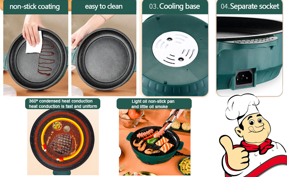 طلاء غير لاصق: تتميز الشواية الكهربائية بطبقة صحية وصديقة للبيئة، والتي يمكن أن توفر إطلاقًا ممتازًا للطعام عند طهي الفطائر الرقيقة والجبن المشوي وشرائح اللحم. يمكنك إضافة كمية زيت أقل من أواني الطهي غير المطلية لتناول طعام صحي أكثر. الوعاء نفسه قابل للفصل ويمكن غسله في غسالة الأطباق، مما يجعل التنظيف سهلاً.